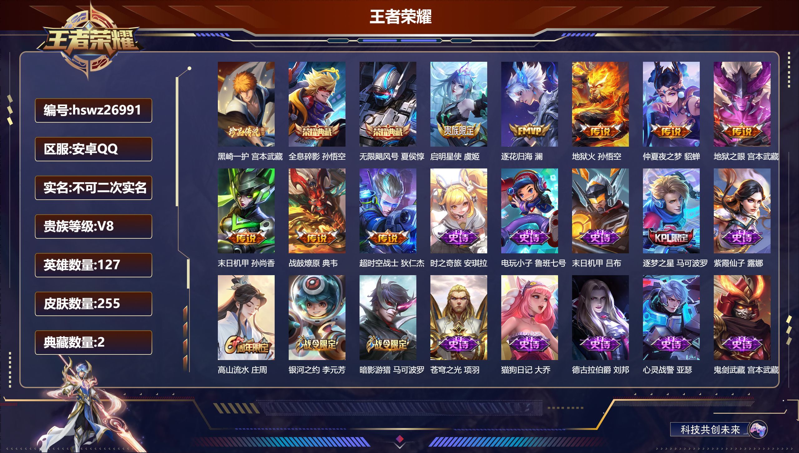 安卓QQ/永恒钻石/255皮肤/127英雄/2典藏/0珍品无双/0无双/1珍品传说/8传说/78史诗