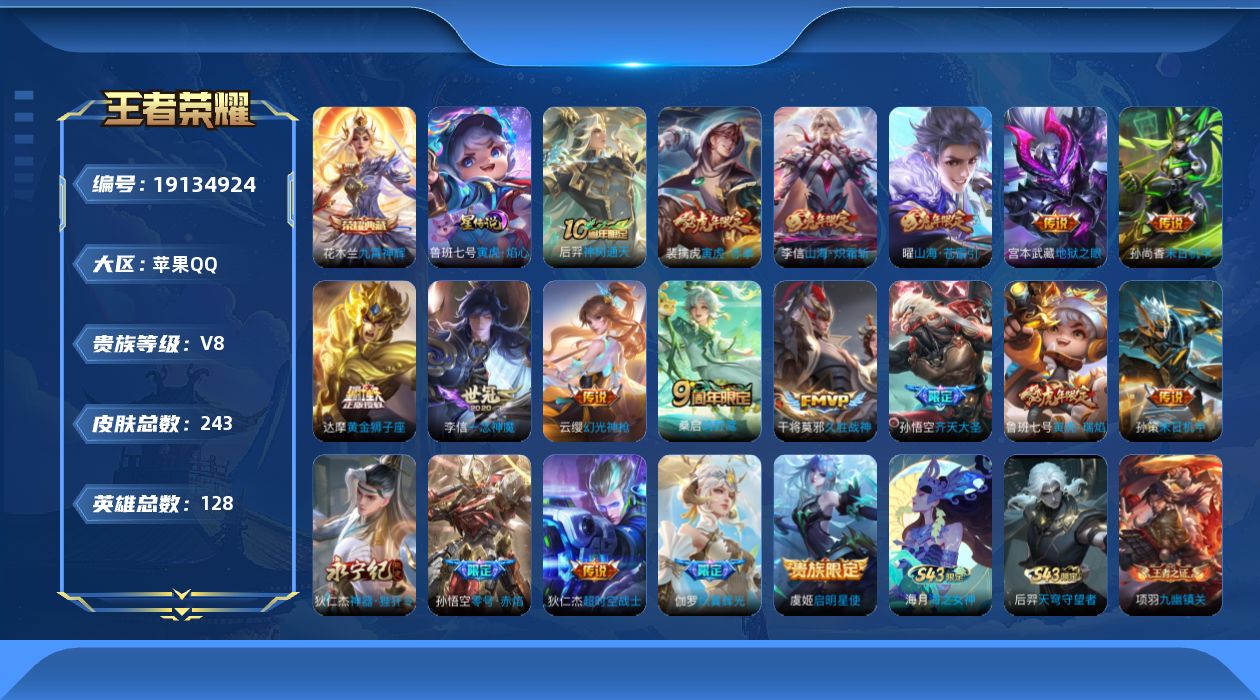V7 皮肤259 英雄128 非凡王者 荣耀典藏1 珍品传说1 传说12