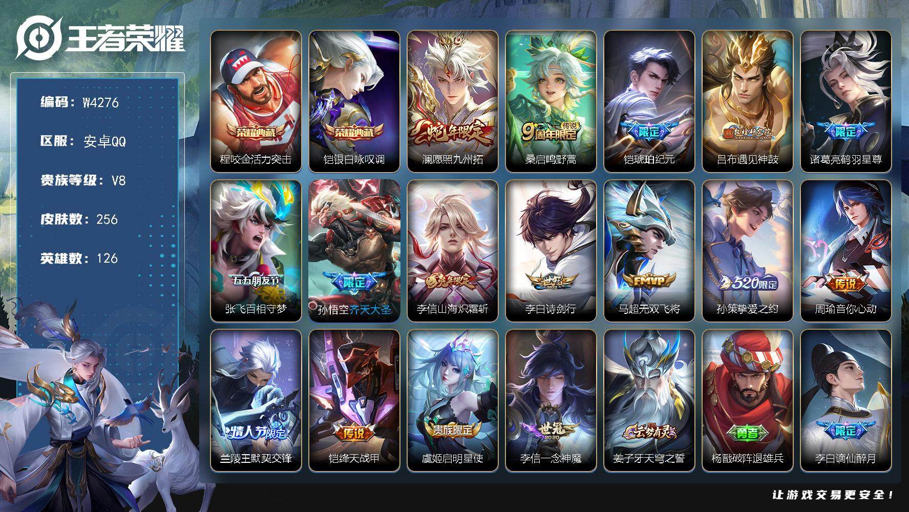 【W4276】安卓Q区-无二次-贵8-126英雄-256皮肤-2典藏-16传说