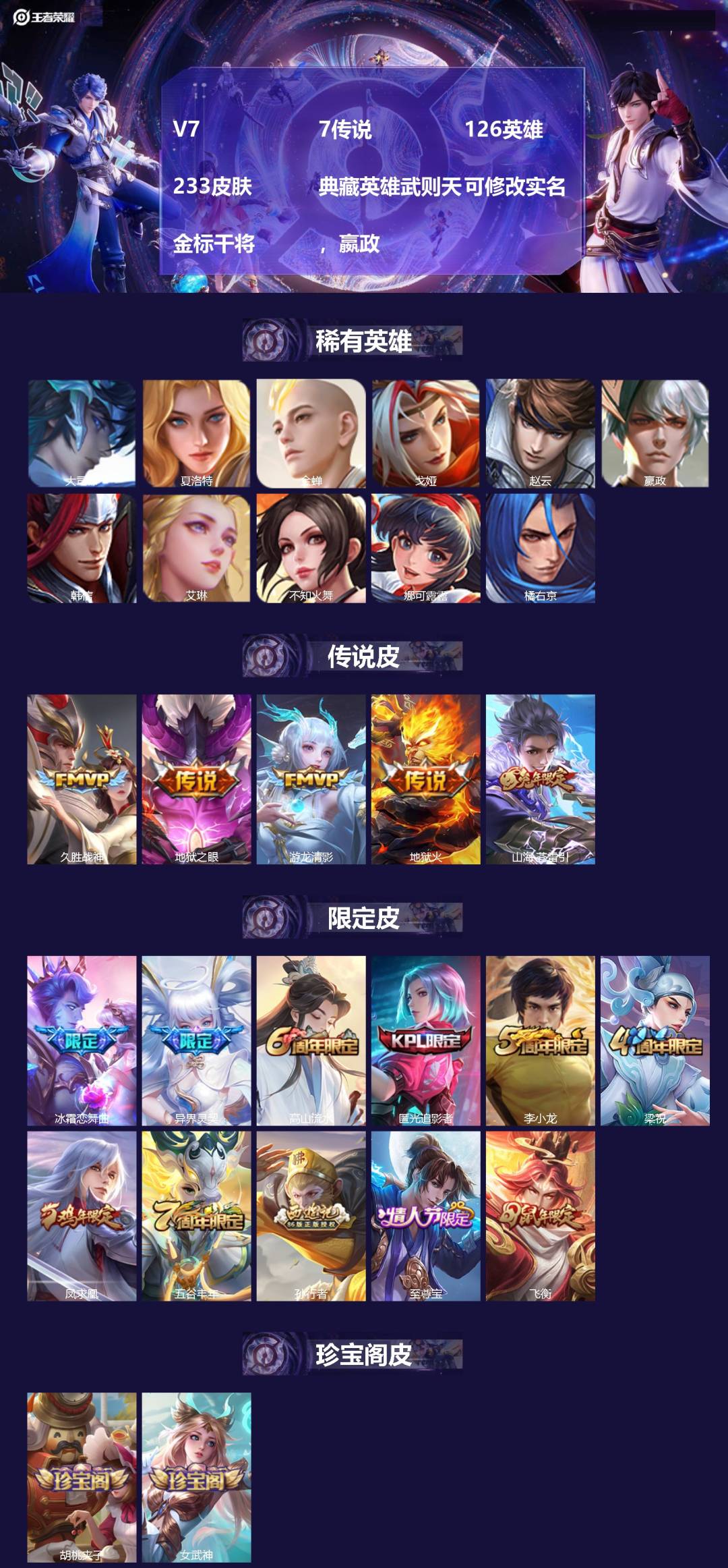 V7 7传说 126英雄 233皮肤 典藏英雄武则天 可修改实名 金标干将