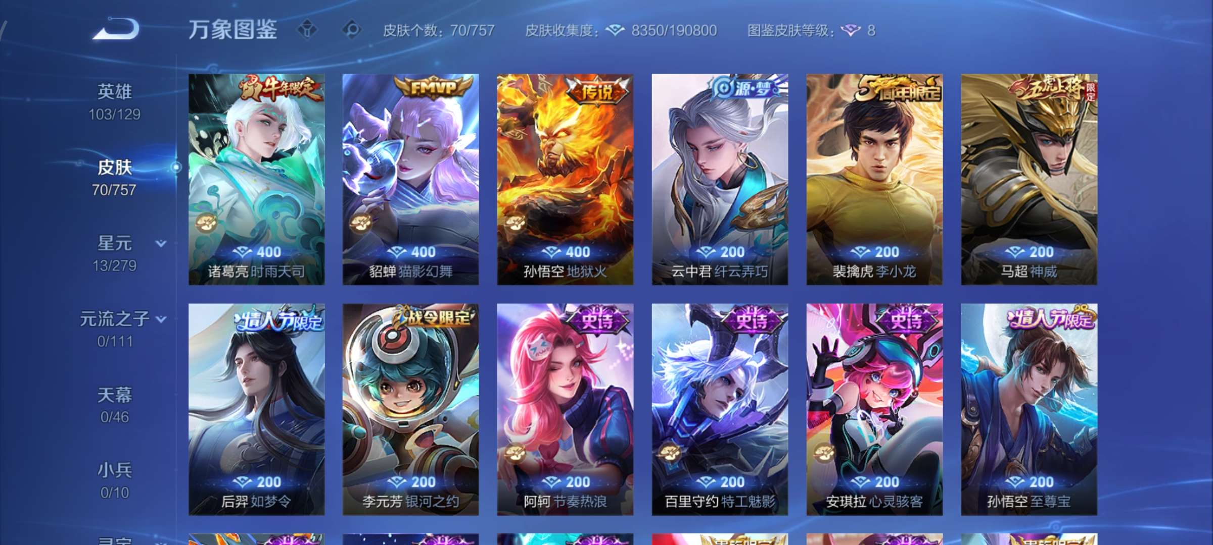 绝世王者-125英雄-266皮肤-1典藏-10传说-71史诗