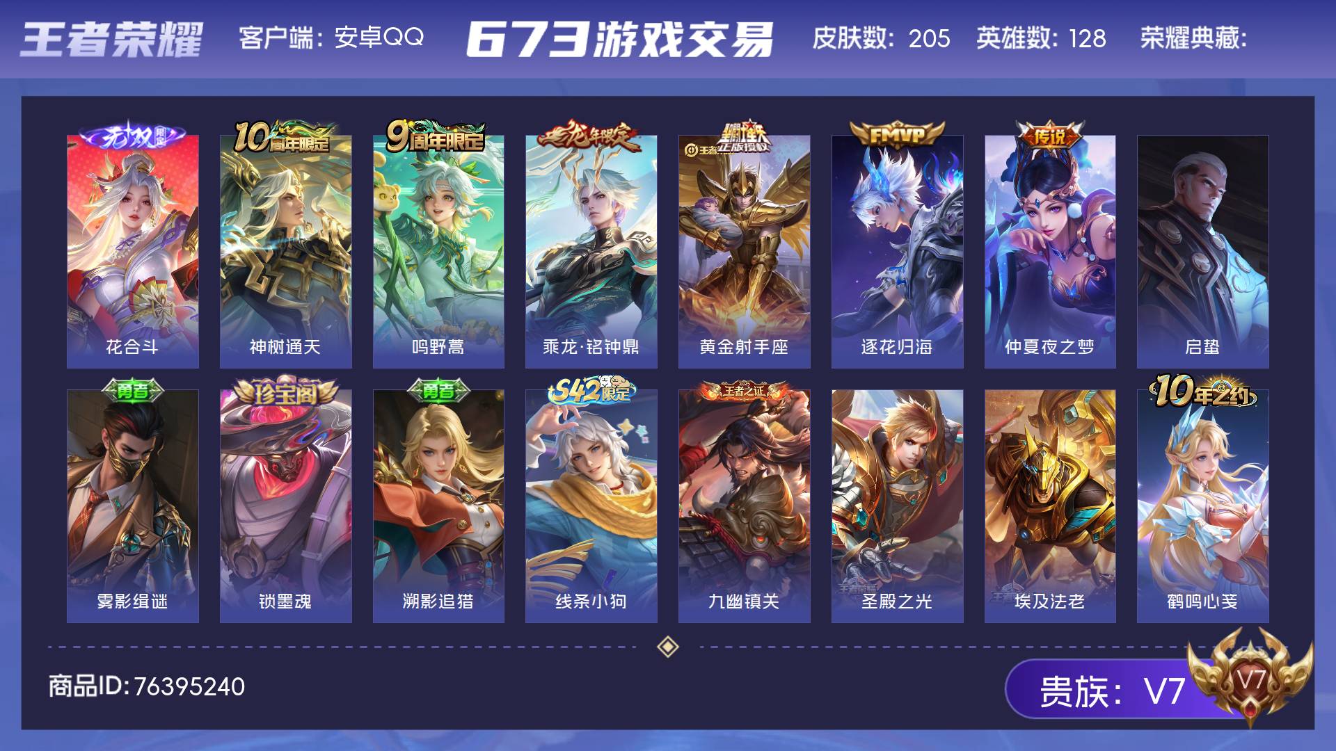 V7 皮肤205 英雄128 永恒钻石 无双皮肤1 传说6