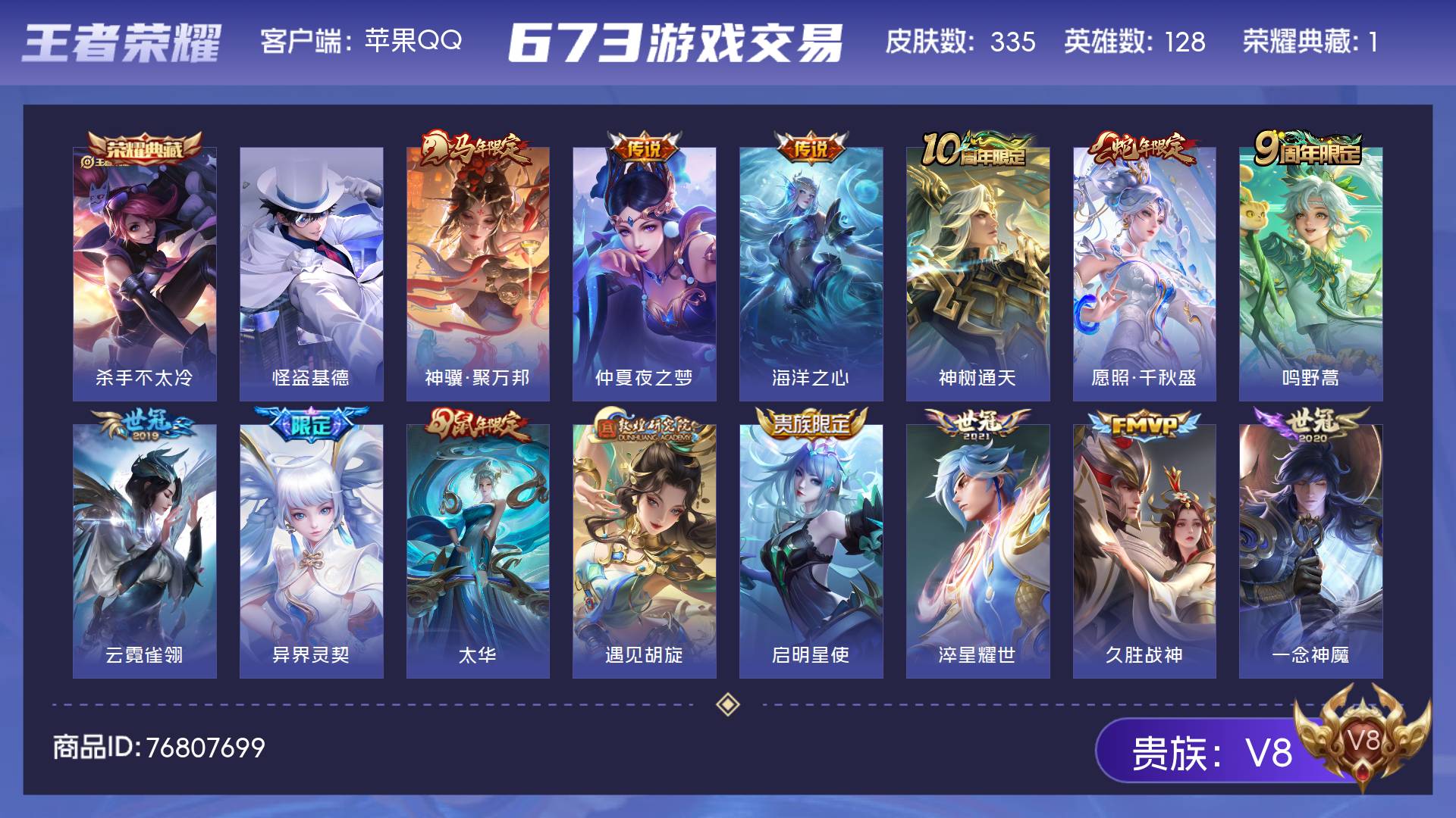 V8 皮肤335 英雄128 至尊星耀 荣耀典藏1 珍品传说1 传说18