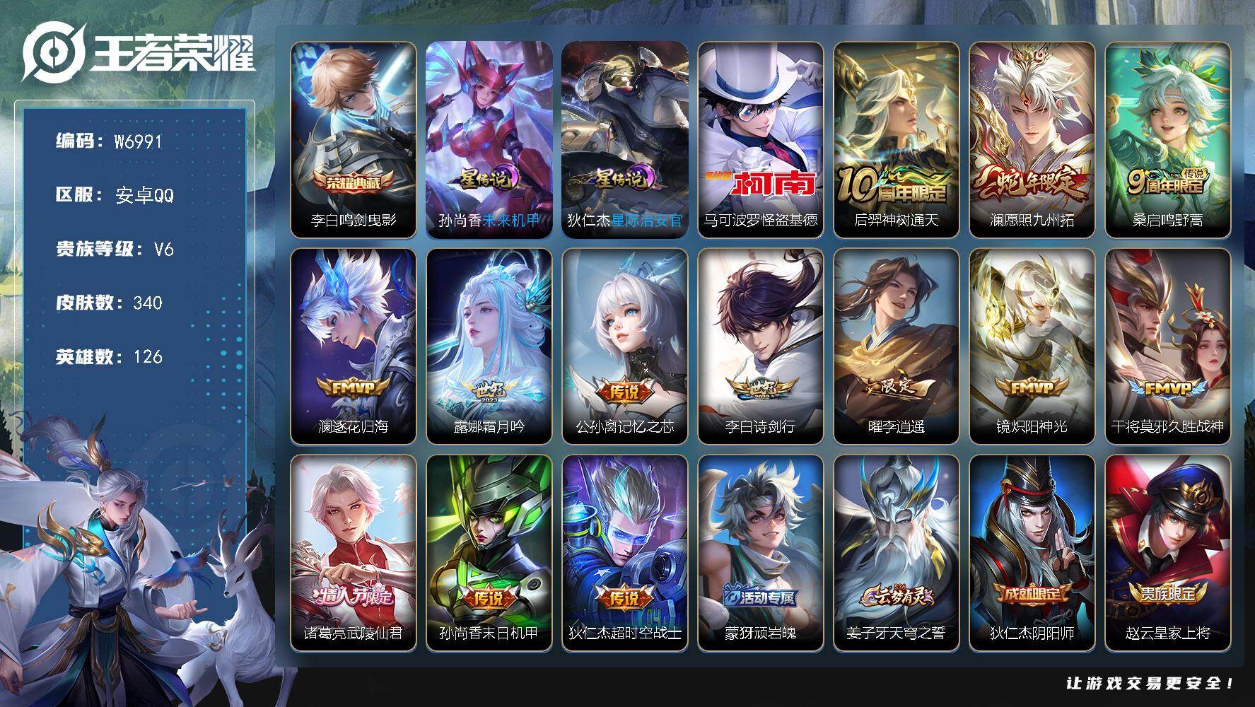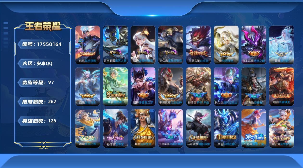 【W6097】安卓Q区-可二次-贵7-127英雄-277皮肤-1典藏-11传说