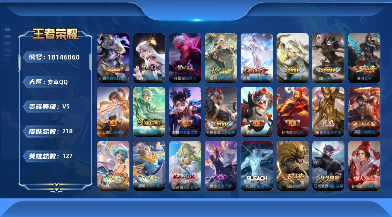 安卓Q-V7-最强王者段位-126英雄-151皮肤-20传说-44史诗【传说皮