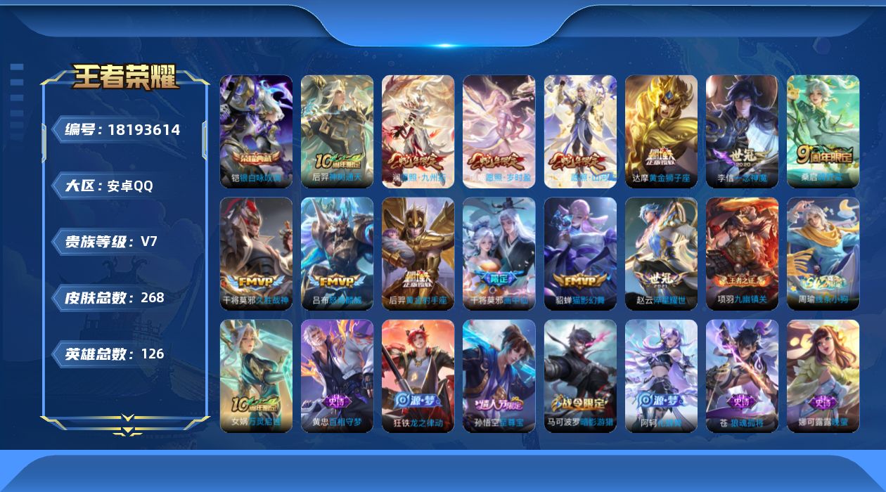 安卓QQ/无双王者/196皮肤/126英雄/1典藏/0珍品无双/0无双/3珍品传说/10传说/51史
