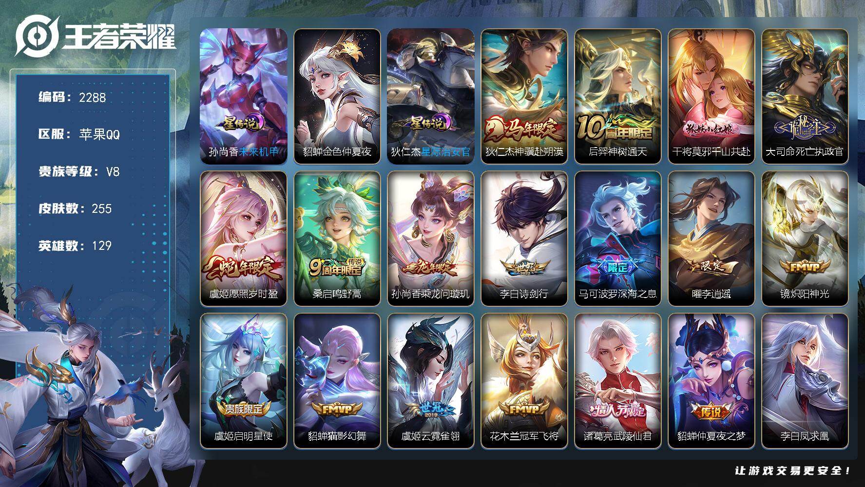 V8-永恒钻石IV段位-129英雄-255皮肤-20传说-65史诗