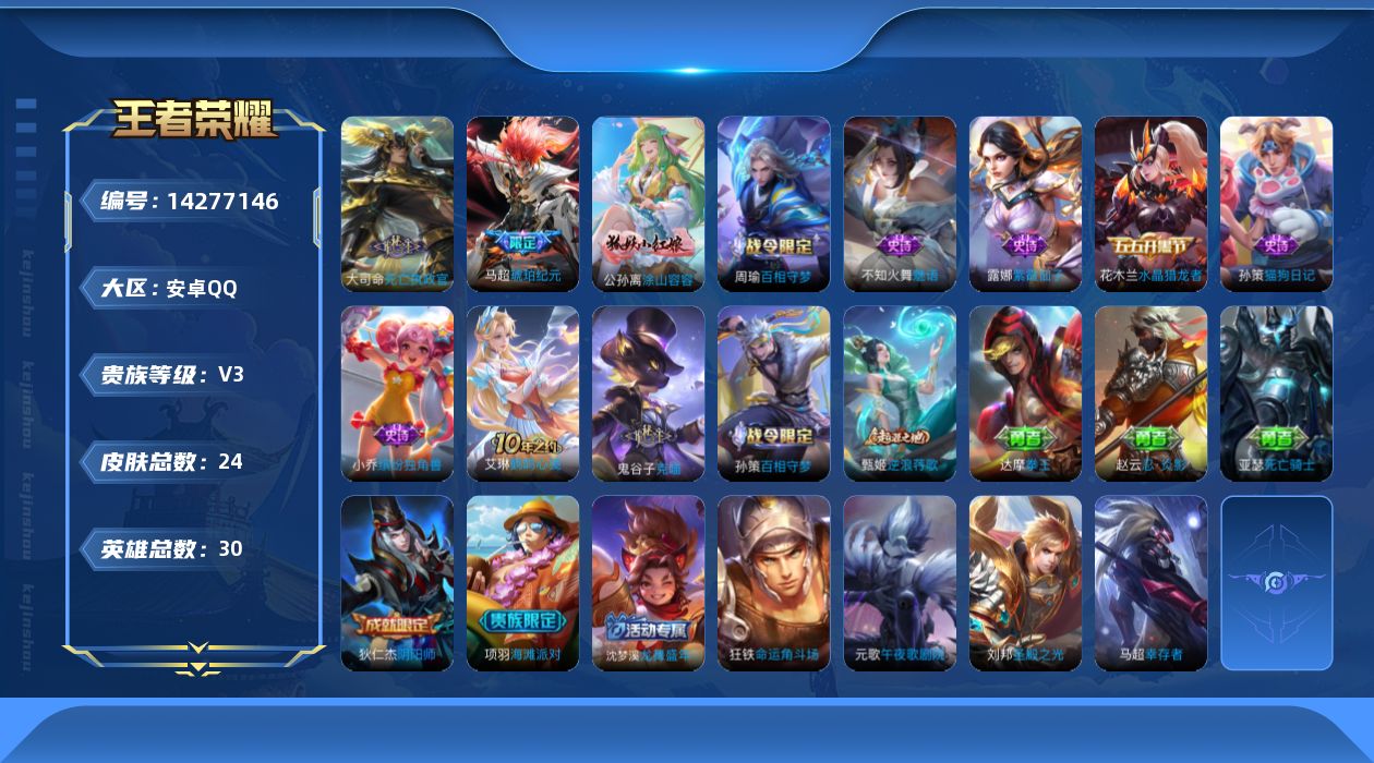 安卓QQ-1典藏-3传说-1无双-223皮肤-126英雄-荣耀王者,连体和平精英