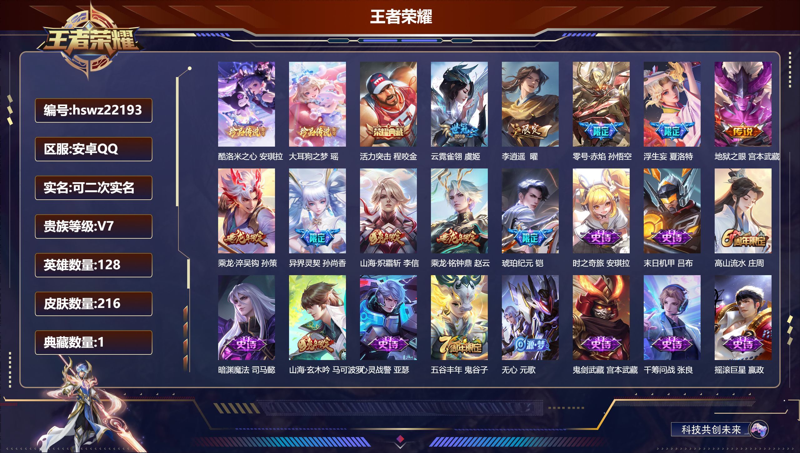 安卓QQ/永恒钻石/216皮肤/128英雄/1典藏/0珍品无双/0无双/2珍品传说/10传说/58史
