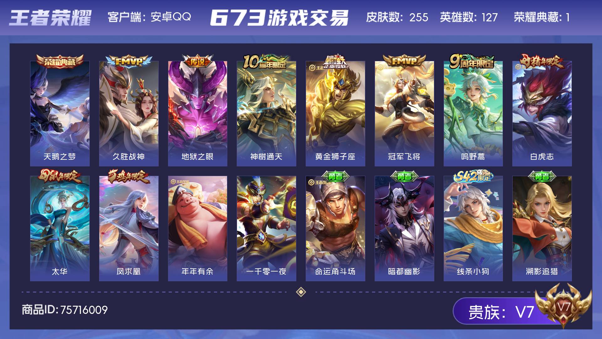 V7 皮肤255 英雄127 非凡王者 荣耀典藏1 星传说1 传说9 其他皮肤251