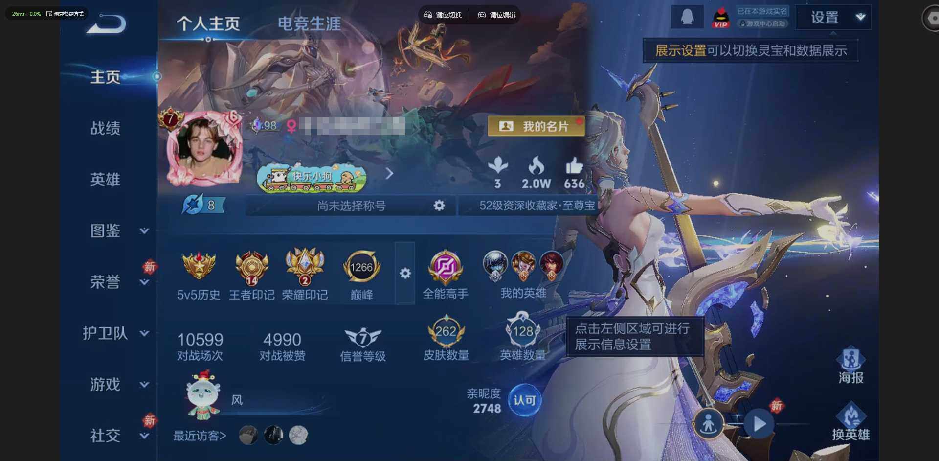 实名: 可修改 贵族等级: V7 英雄数: 128 皮肤数: 262 荣耀水晶