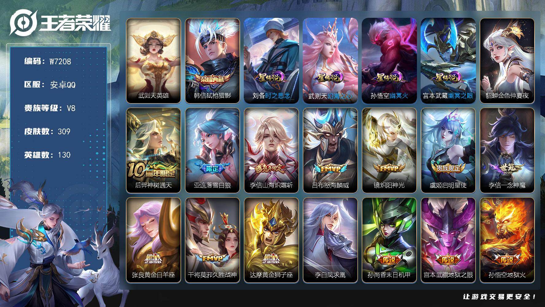 贵族等级: V8 英雄数: 128 皮肤数: 289 荣耀水晶: 九霄神辉 星