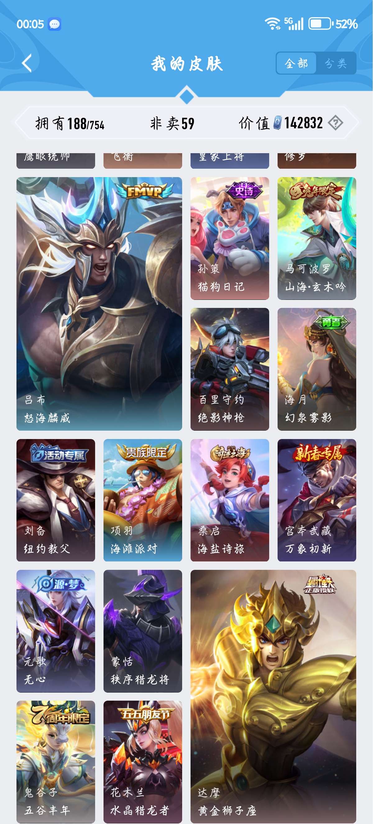 皮肤188 英雄126 荣耀王者 荣耀典藏1 珍品传说1 传说9 其他皮肤74-不想玩了 有意者联系 可砍价