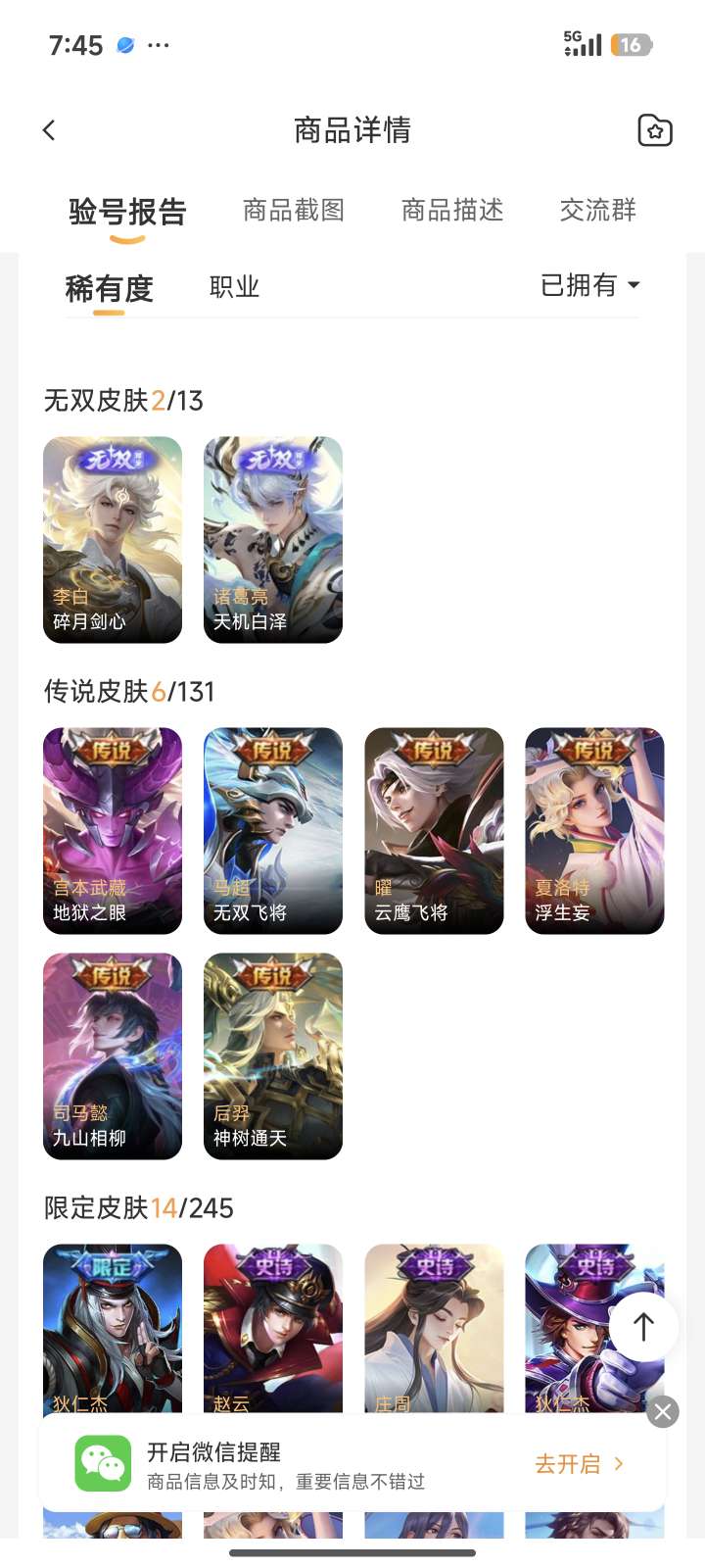 可二次实名/至圣王者/227皮肤/127英雄/1典藏/1珍品传说/11传说/78史诗