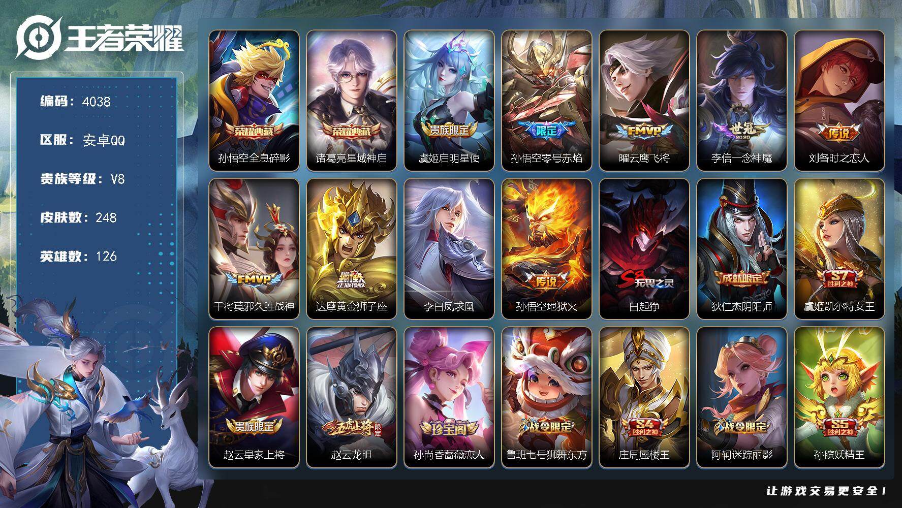安卓Q-V8-永恒钻石IV段位-126英雄-248皮肤-2典藏皮肤-9传说-5