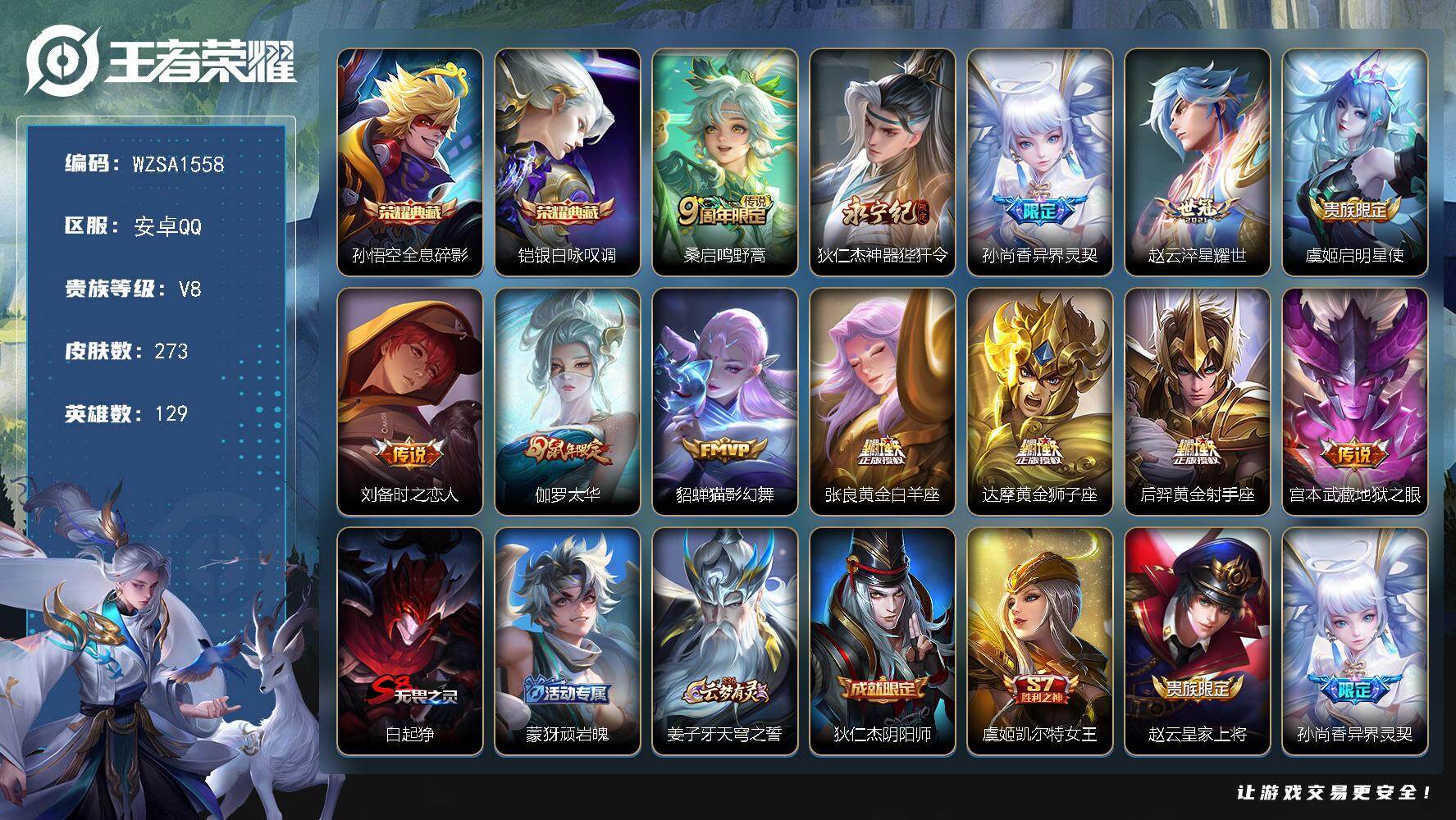 【WZSA1558】贵族8/皮肤273/典藏2/传说12/史诗65/英雄129