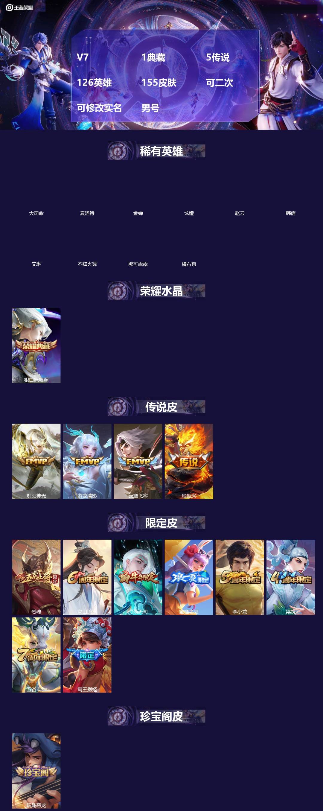 []V7 1典藏 5传说 126英雄 155皮肤 可二次 可修改实名 男号 【