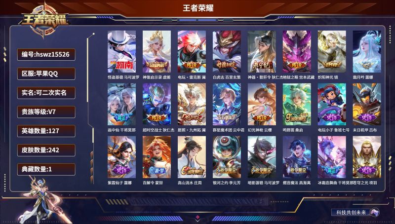 苹果QQ/尊贵铂金/242皮肤/127英雄/1典藏/0珍品无双/0无双/1珍品传说/12传说/73史