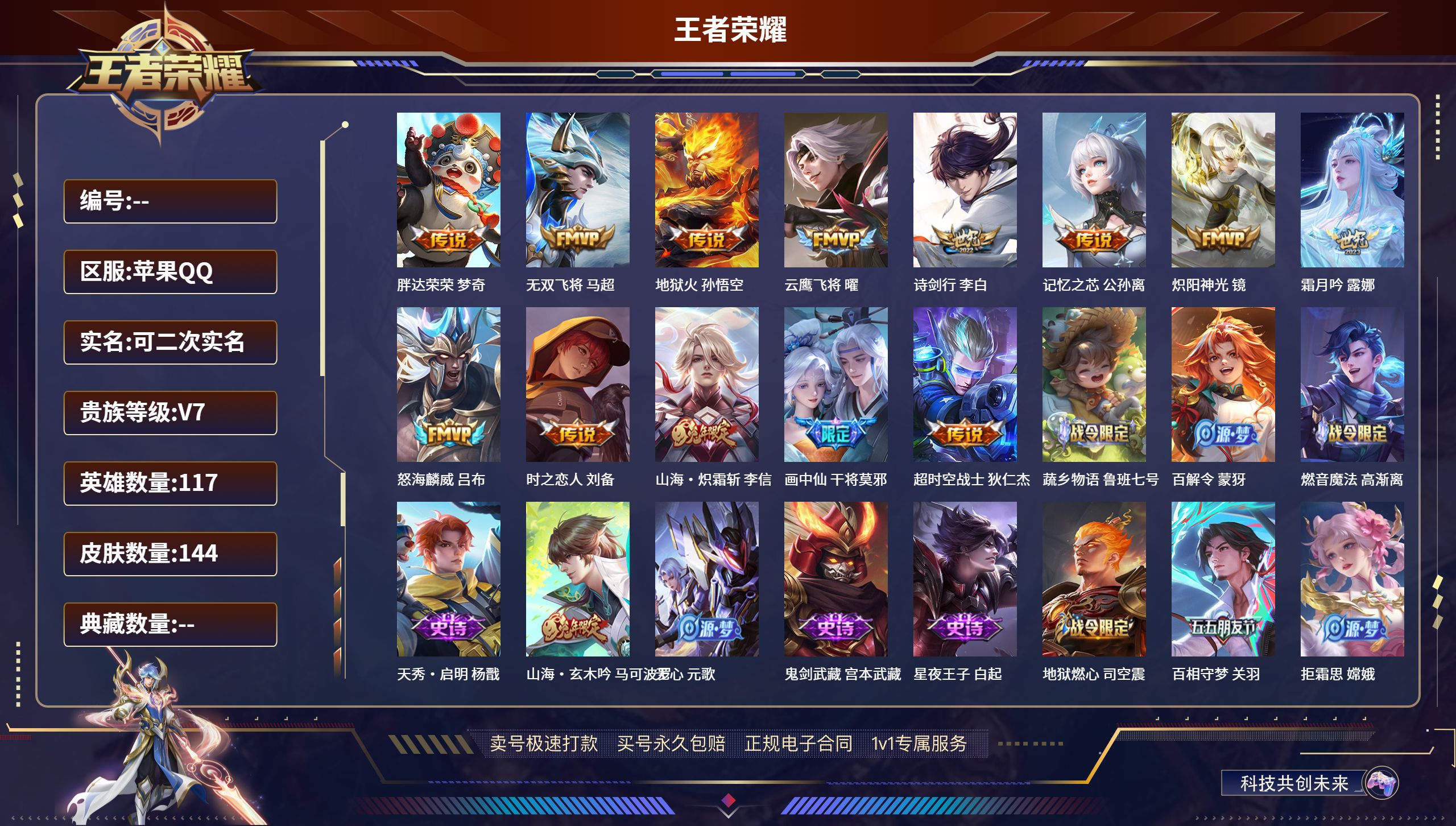 实名: 可修改 贵族等级: V7 英雄数: 127 皮肤数: 224 星传说: