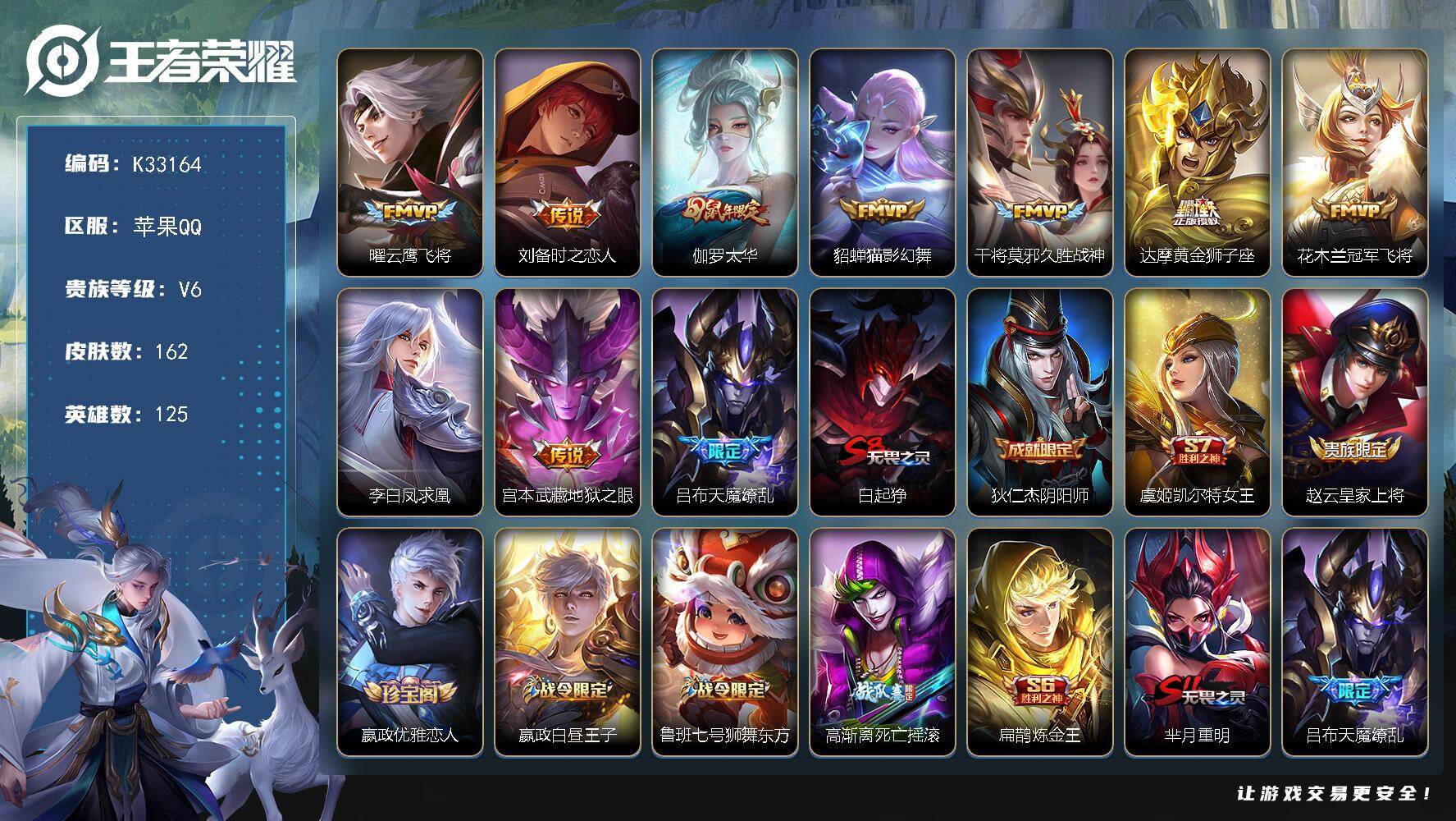 V6-永恒钻石I段位-125英雄-162皮肤-10传说-44史诗