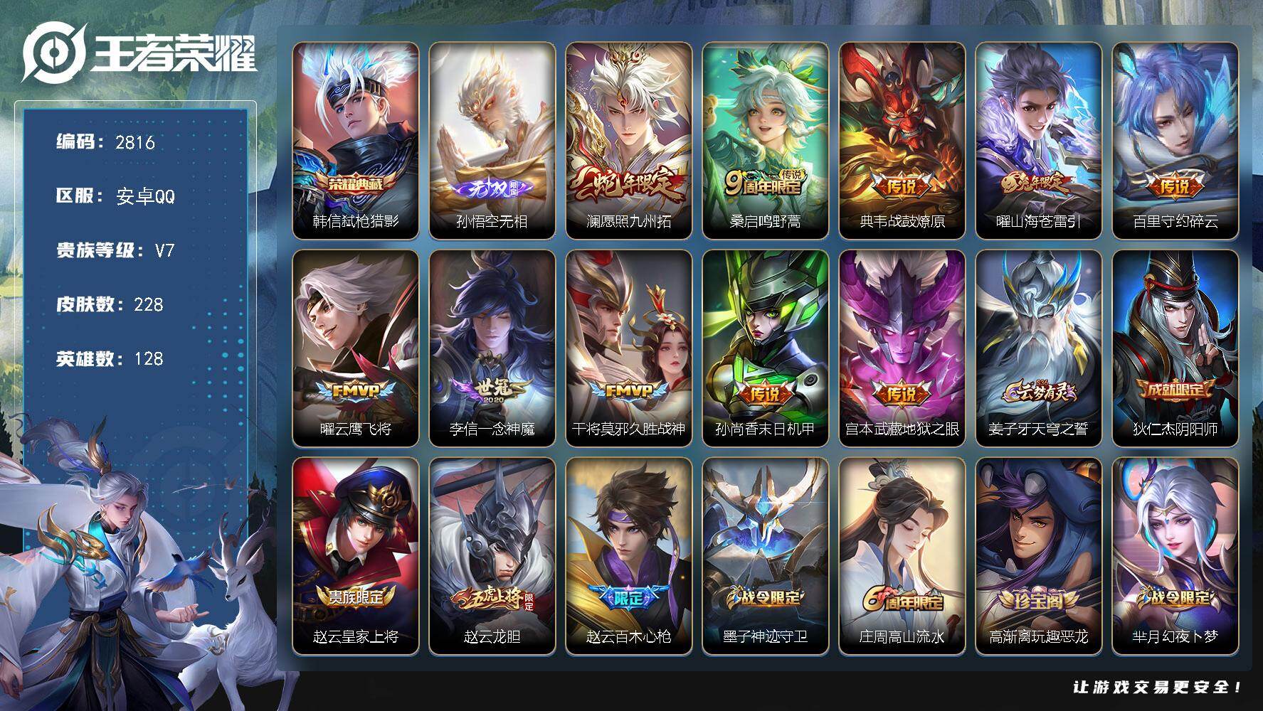 安卓Q-V7-至尊星耀V段位-128英雄-247皮肤-6传说-66史诗【英雄全