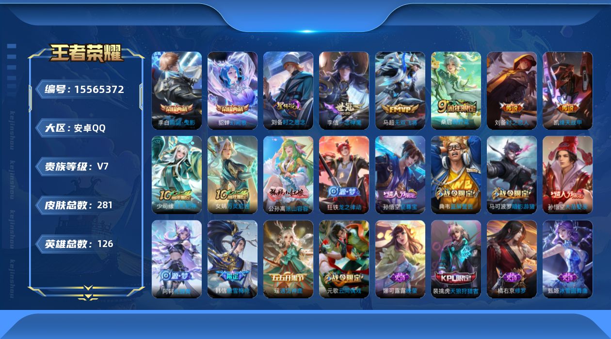 安卓QQ 皮肤266 英雄125 典藏2 传说16 其他皮肤92 至尊星耀-