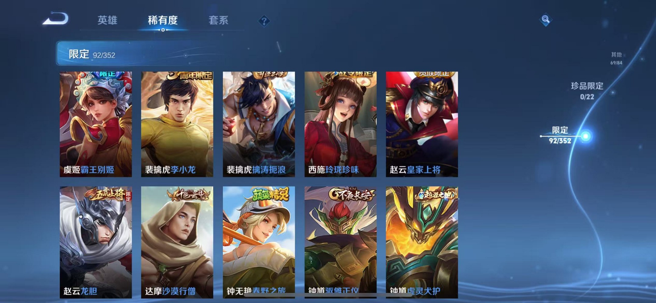 贵族等级: V7 英雄数: 125 皮肤数: 256 荣耀水晶: 弑枪猎影 传
