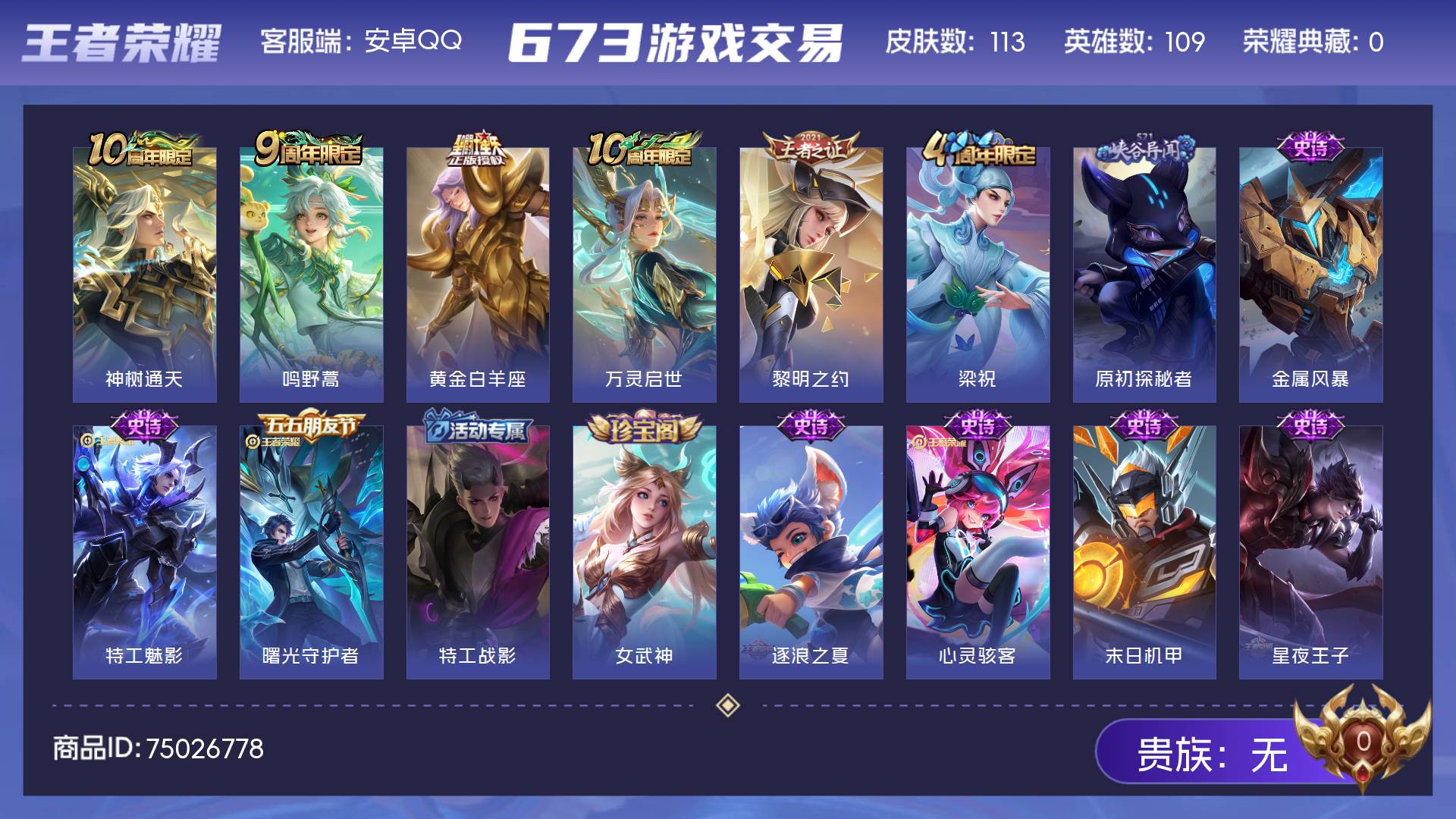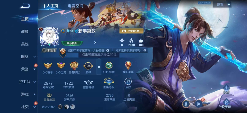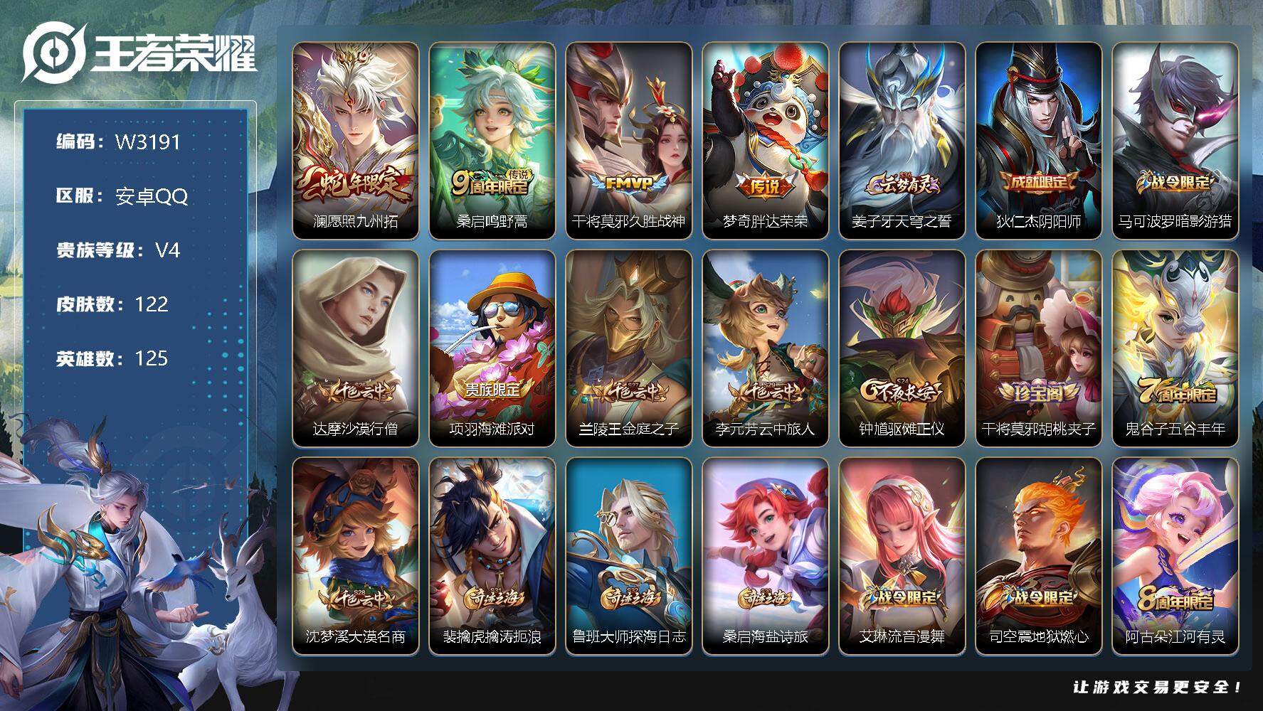 实名: 可修改 贵族等级: V5 英雄数: 122 皮肤数: 125 传说皮: