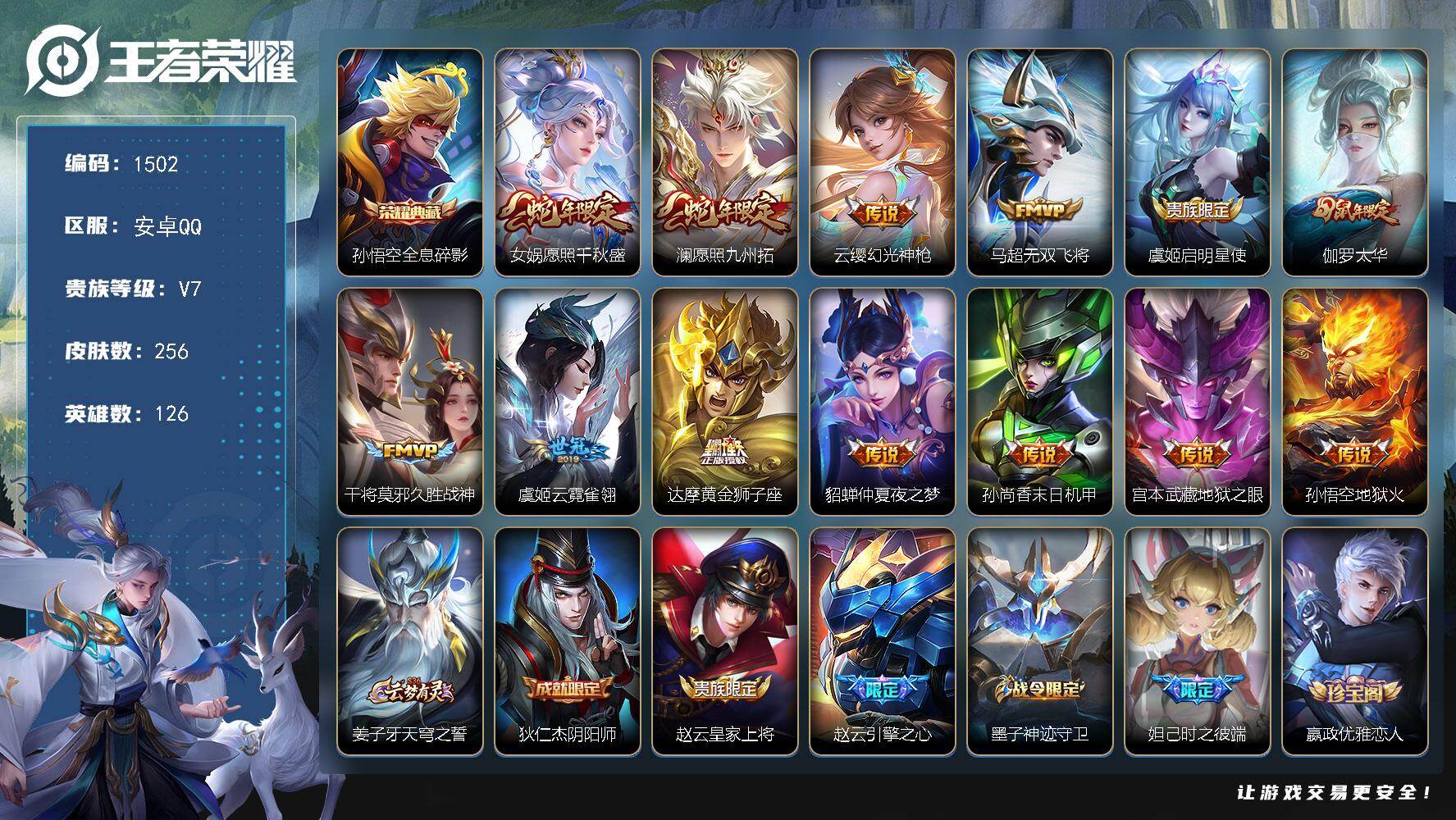 安卓QQ/无双王者/235皮肤/127英雄/2典藏/0珍品无双/0无双/2珍品传说/6传说/60史诗
