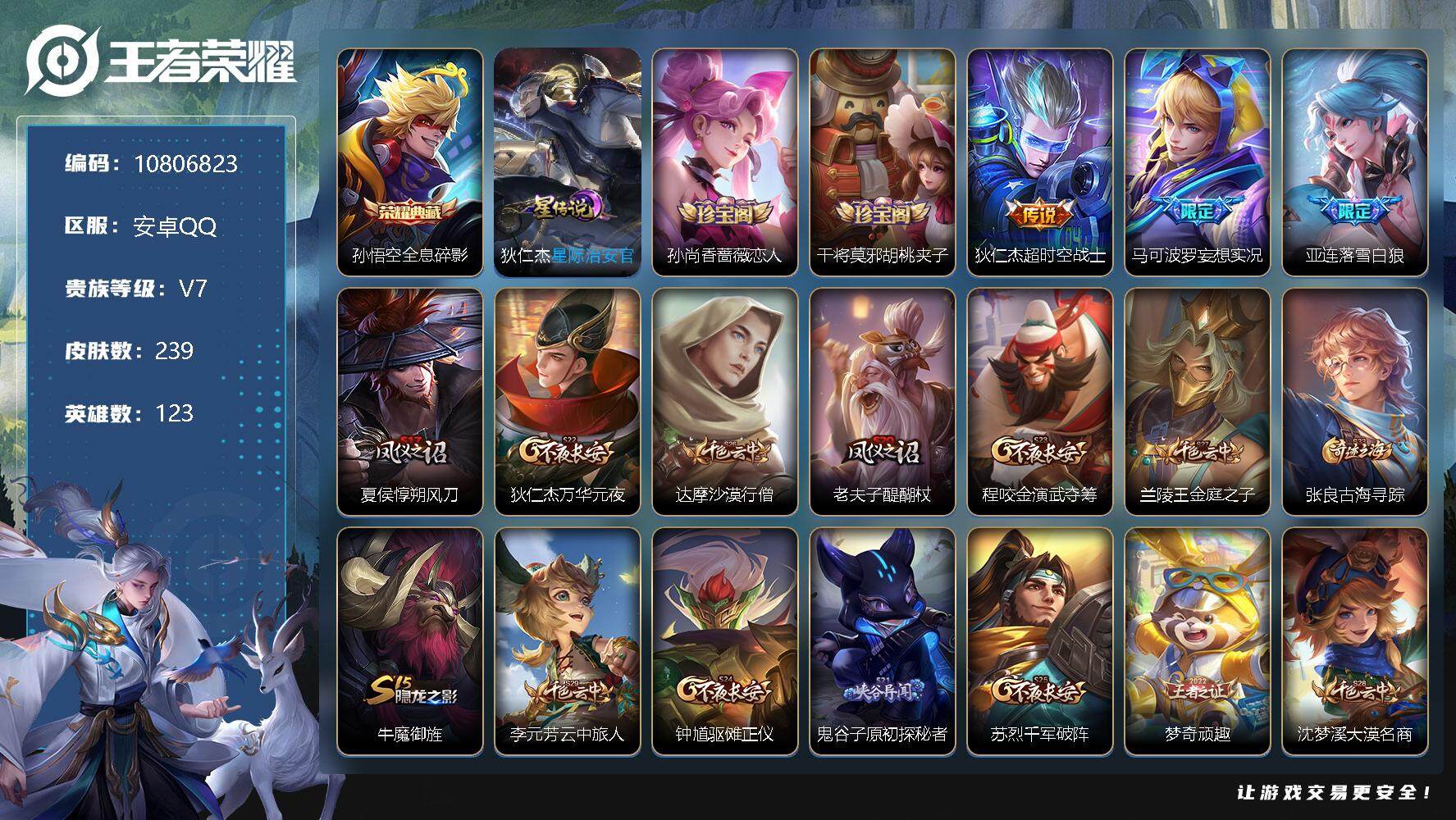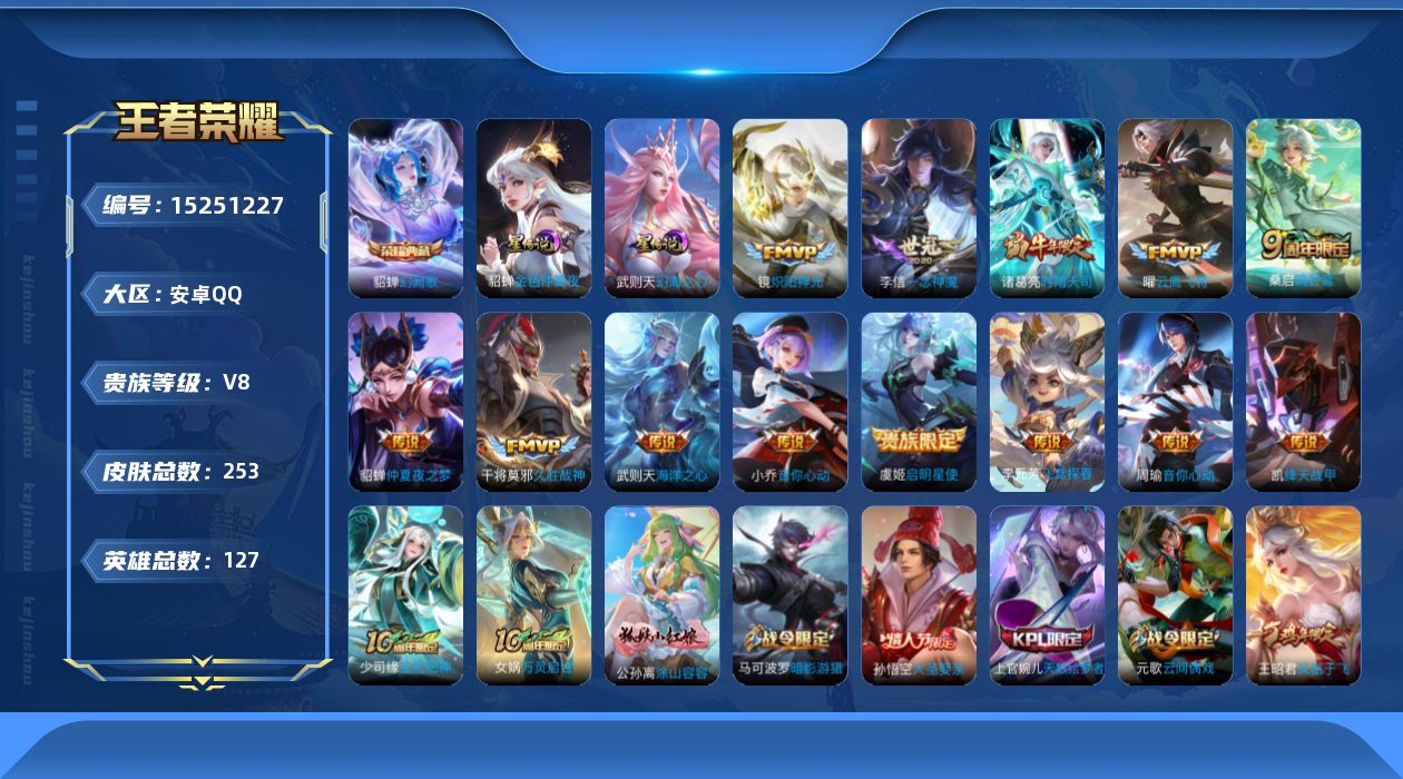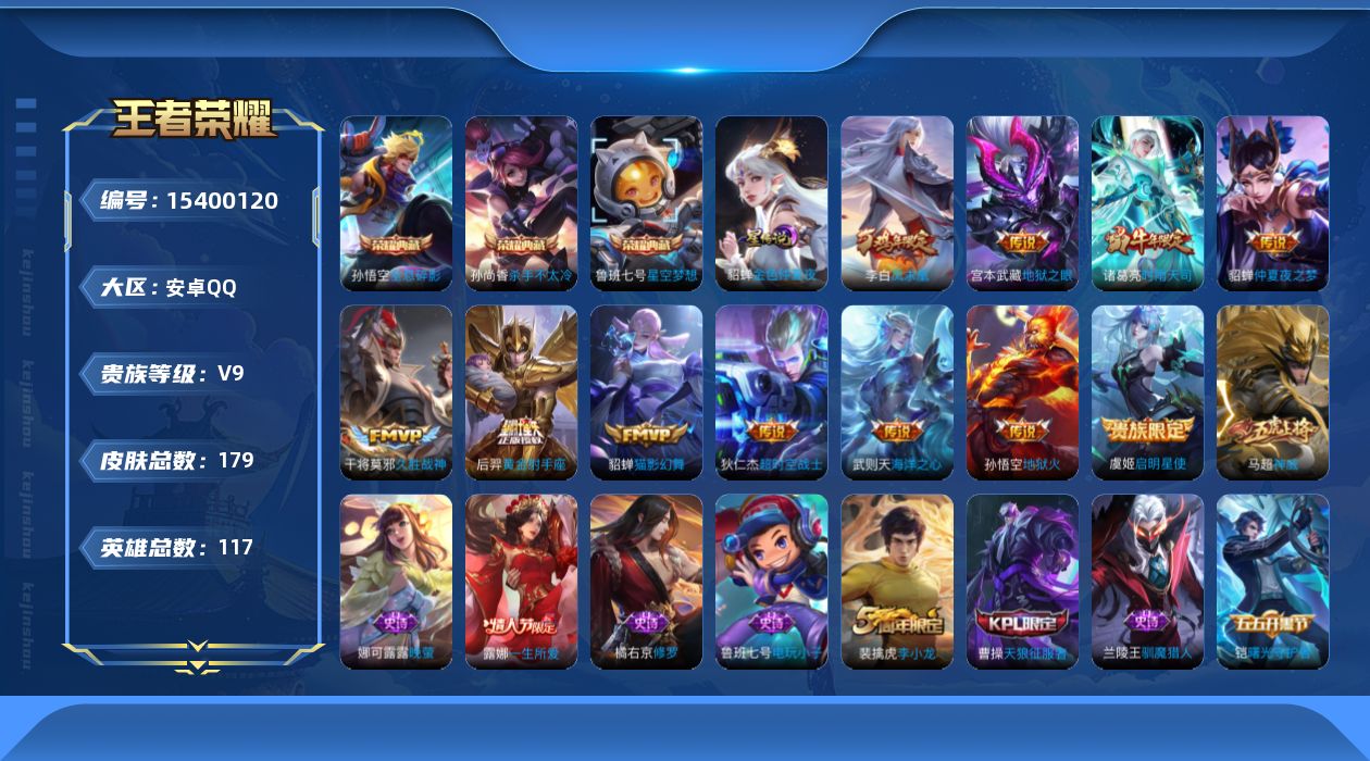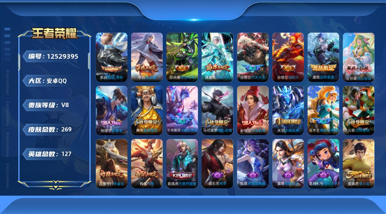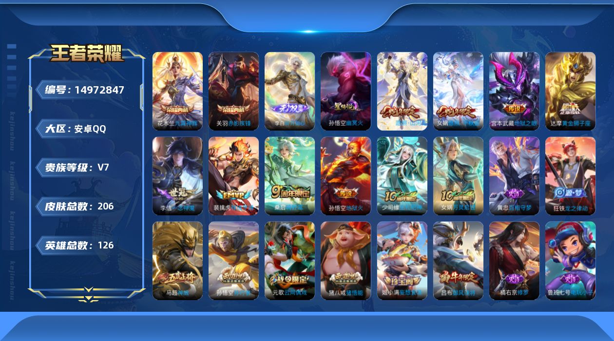 安卓QQ/尊贵铂金/233皮肤/125英雄/2典藏/0珍品无双/0无双/0珍品传说/10传说/71史