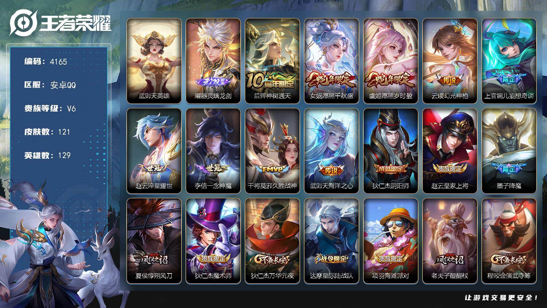 安卓Q-V8-最强王者段位-125英雄-211皮肤-4典藏-0珍品无双-0无双