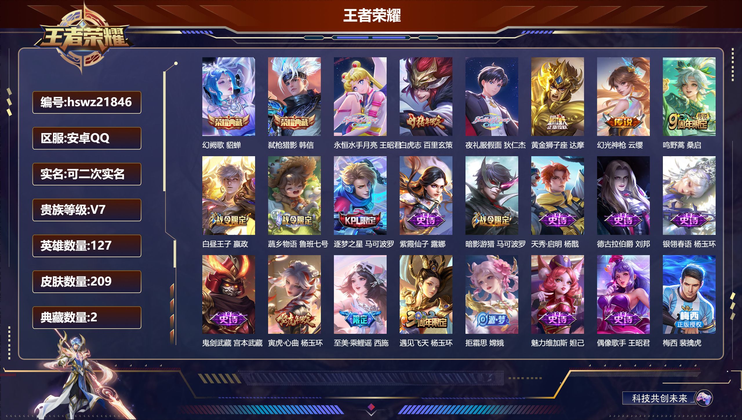 安卓QQ/绝世王者/209皮肤/127英雄/2典藏/0珍品无双/0无双/0珍品传说/6传说/51史诗