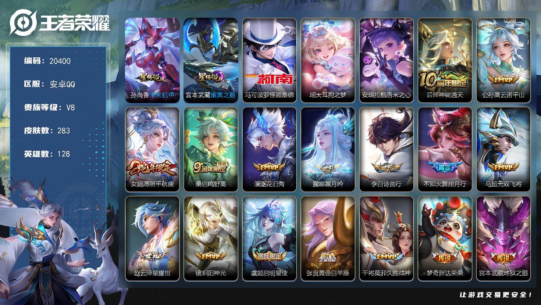 安卓Q-V8-永恒钻石I段位-126英雄-300皮肤-2典藏皮肤-1珍品传说-