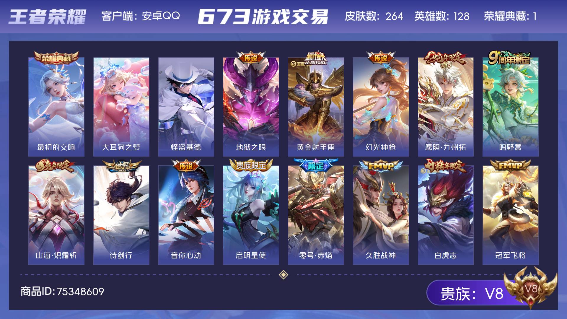 V8 皮肤264 英雄128 永恒钻石 荣耀典藏1 珍品传说2 传说13 其他皮肤254