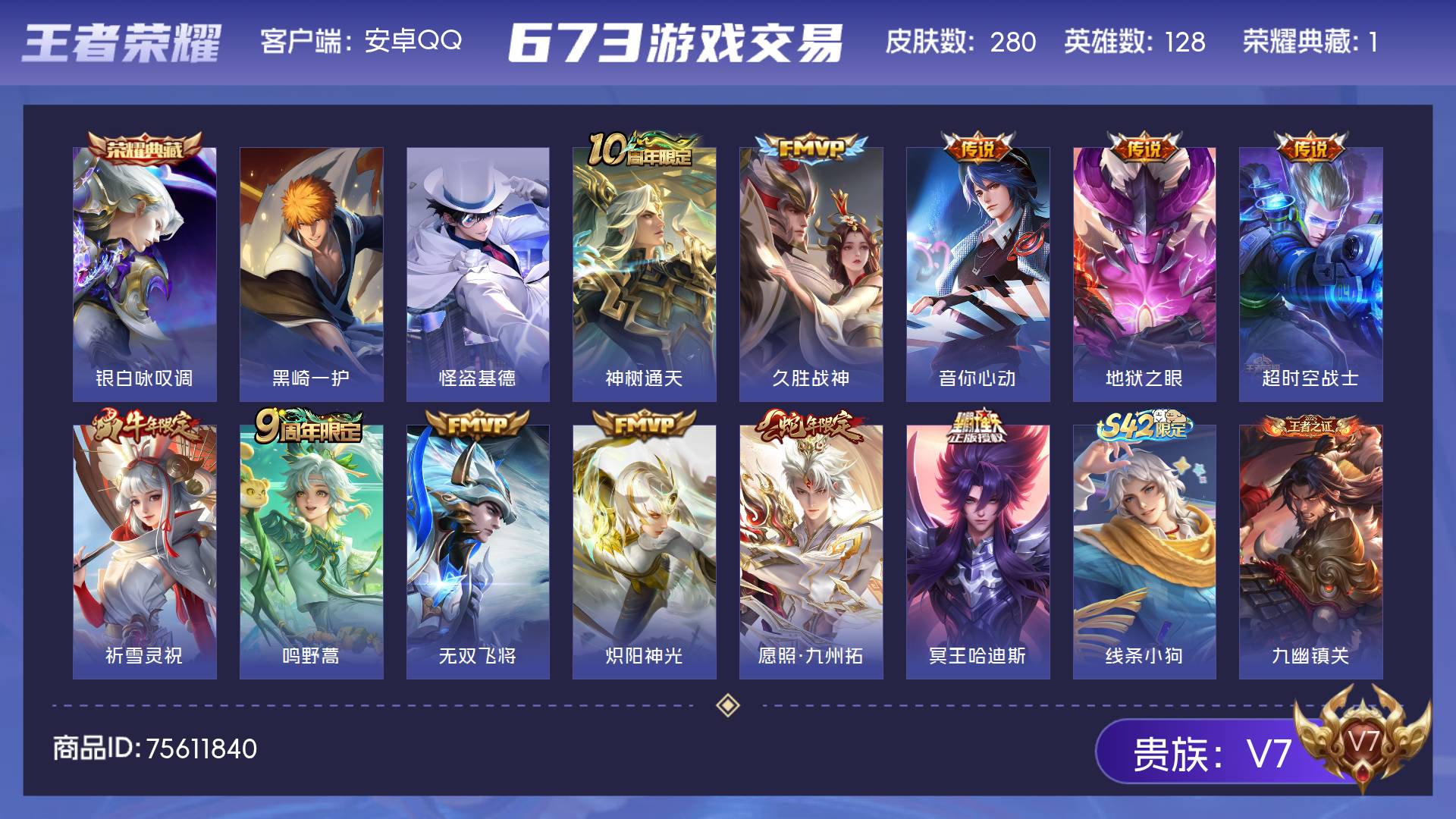 V7 皮肤280 英雄128 永恒钻石 荣耀典藏1 珍品传说2 传说11 其他皮肤272