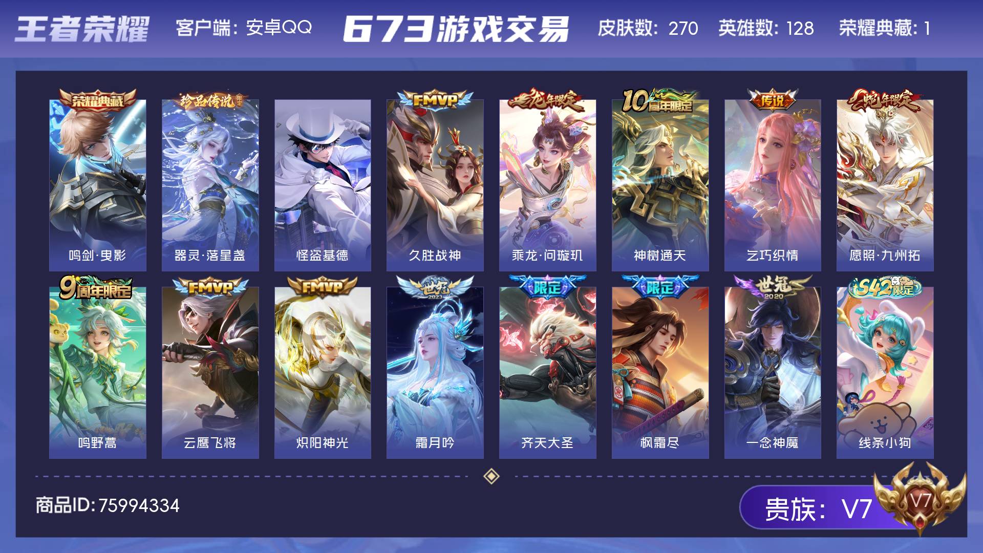 V7 皮肤270 英雄128 至尊星耀 荣耀典藏1 珍品传说2 传说12 其他皮肤260