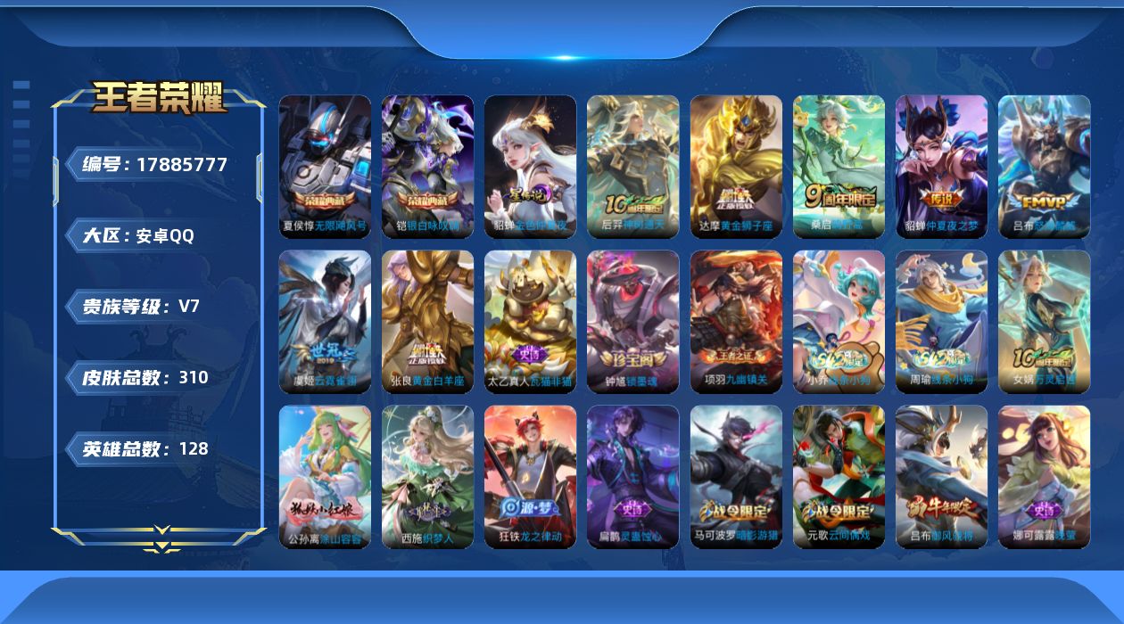 V7-最强王者段位-128英雄-310皮肤-1星元-2典藏皮肤-7传说-90史诗