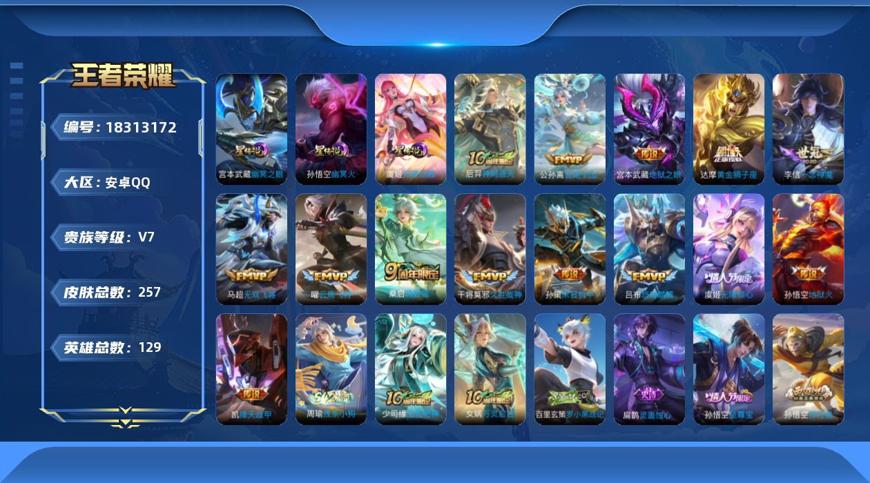 V1-最强王者段位-123英雄-189皮肤-1典藏皮肤-7传说-40史诗