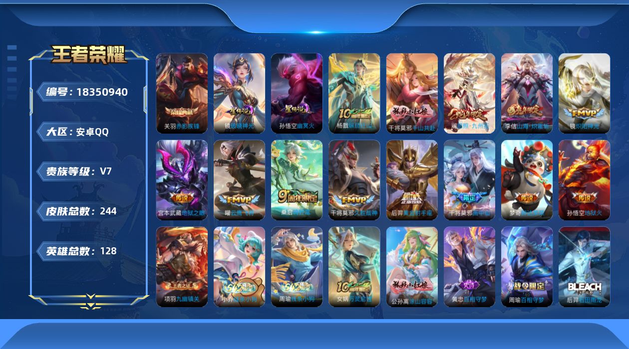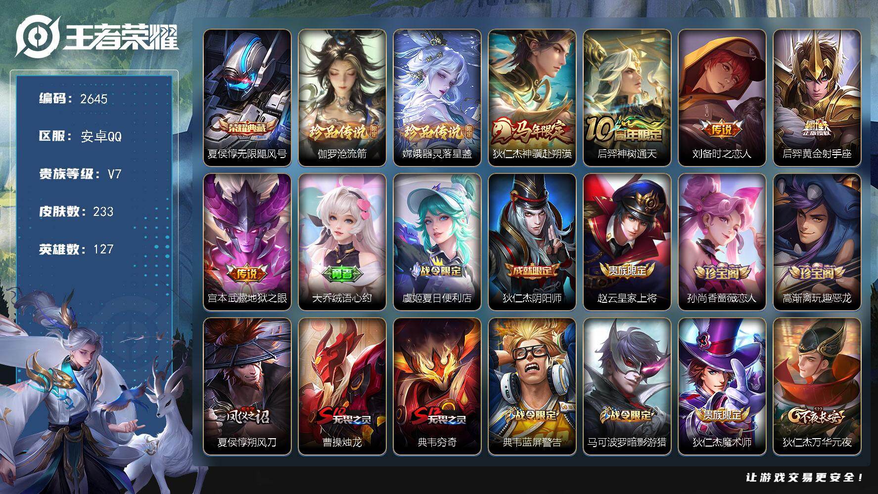 安卓Q-V7-最强王者段位-127英雄-233皮肤-1典藏皮肤-2珍品传说-5传