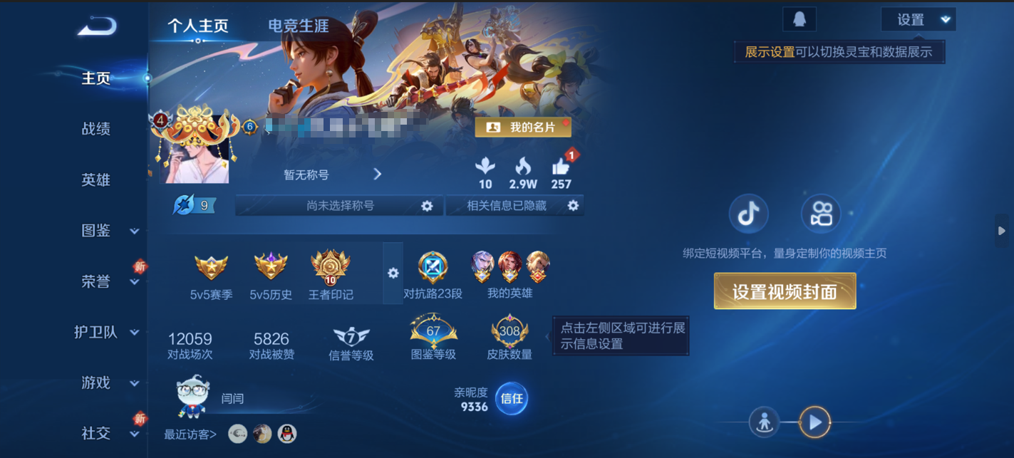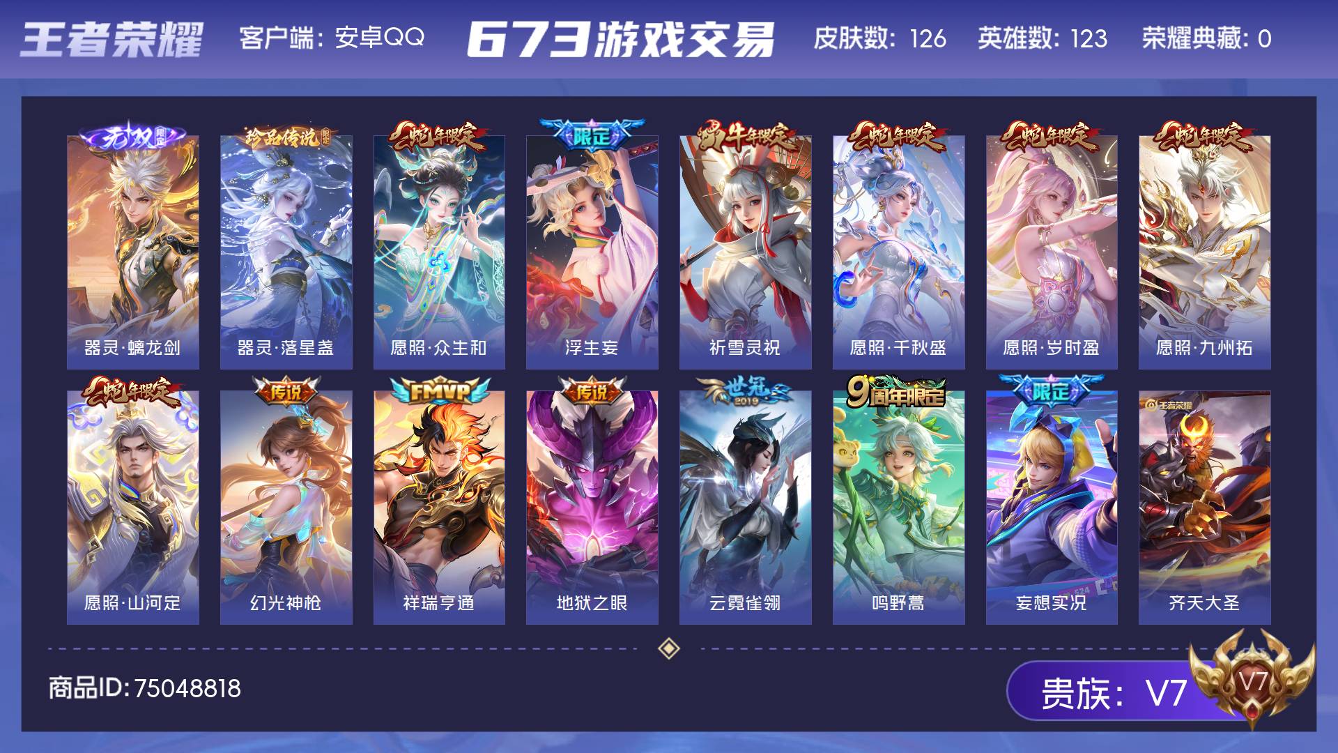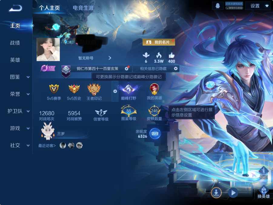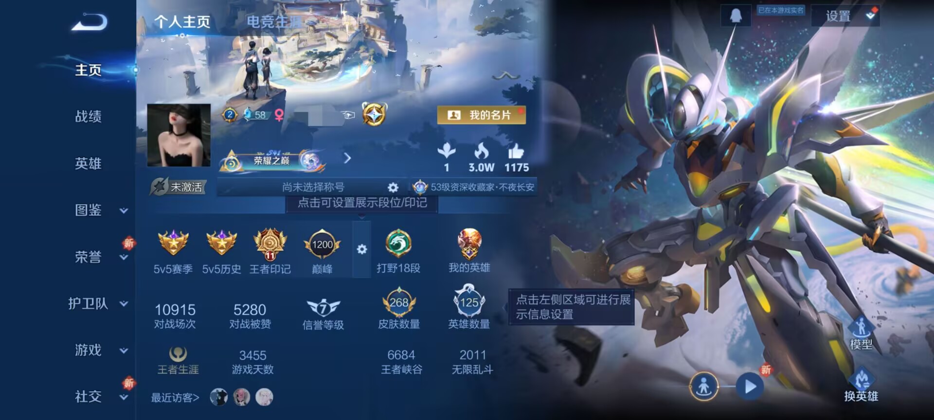 实名: 可修改 贵族等级: V8 英雄数: 126 皮肤数: 213 荣耀水晶