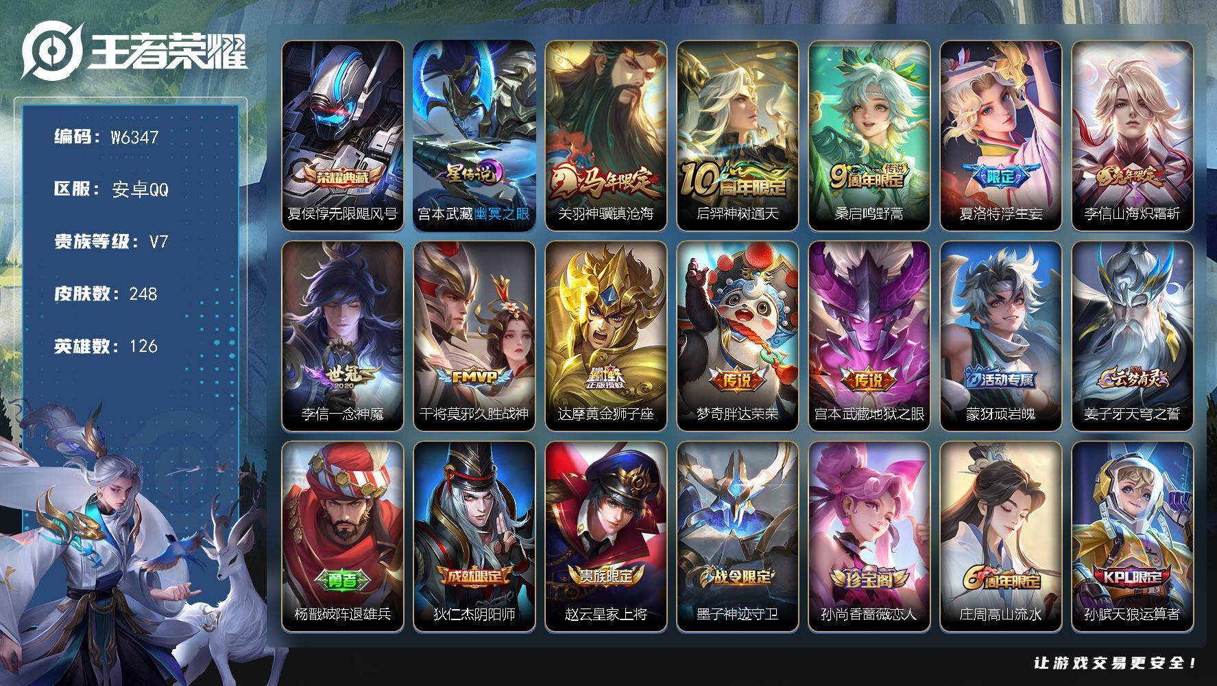 安卓QQ/荣耀王者/202皮肤/126英雄/0典藏/0珍品无双/0无双/2珍品传