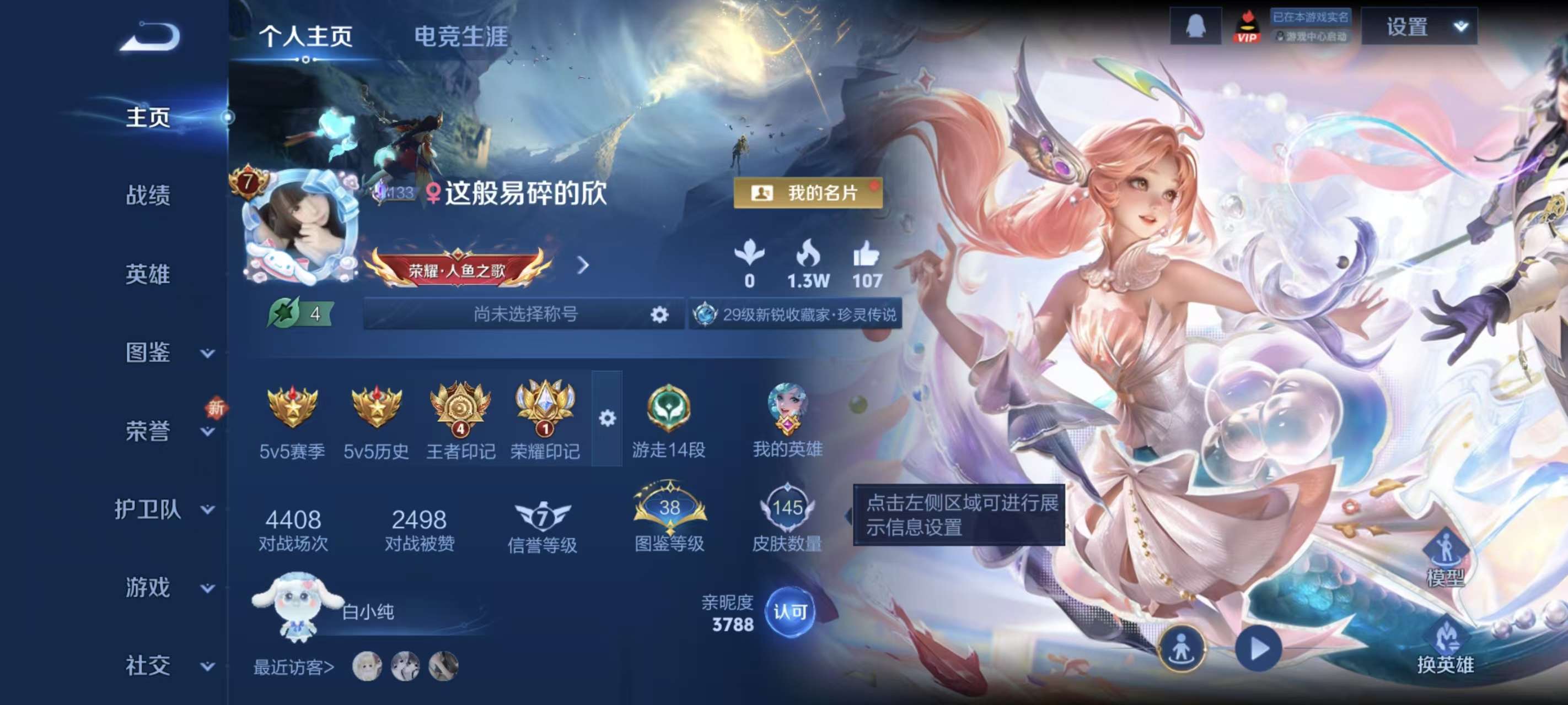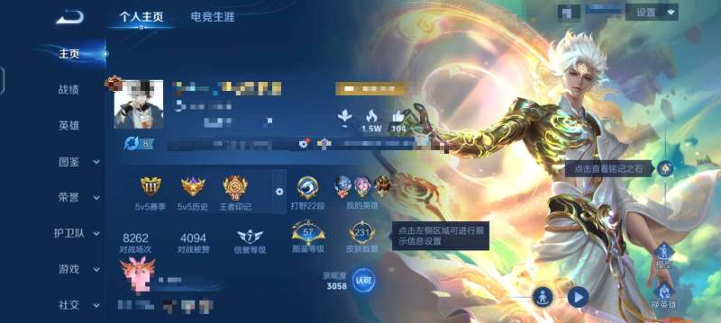 实名: 可修改 贵族等级: V8 英雄数: 127 皮肤数: 259 荣耀水晶