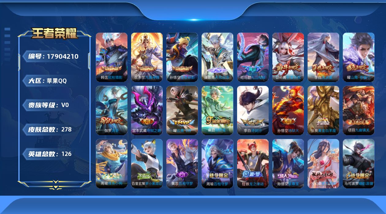 苹果WX-V7-最强王者段位-126英雄-183皮肤-11传说-59史诗【英
