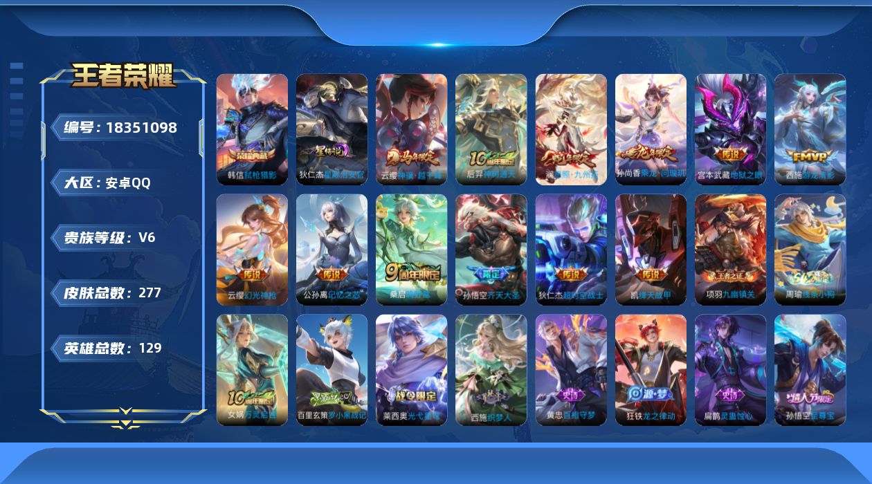 【mwz251】安卓Q-V8-最强王者段位-128英雄-336皮肤-1典藏皮肤