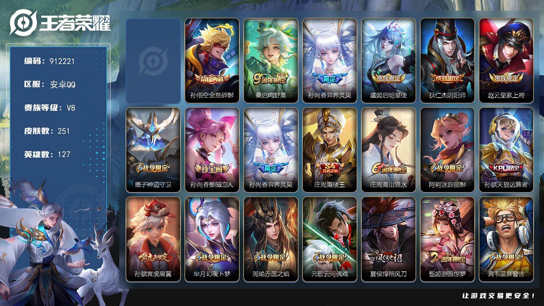 V8-荣耀黄金I段位-127英雄-251皮肤-1典藏皮肤-3传说-58史诗 【英雄全皮】:孙权全皮 【荣耀典藏】:孙悟空全息碎影 【传说皮肤】:桑启鸣野蒿,孙尚香异界灵契,虞姬启明星使