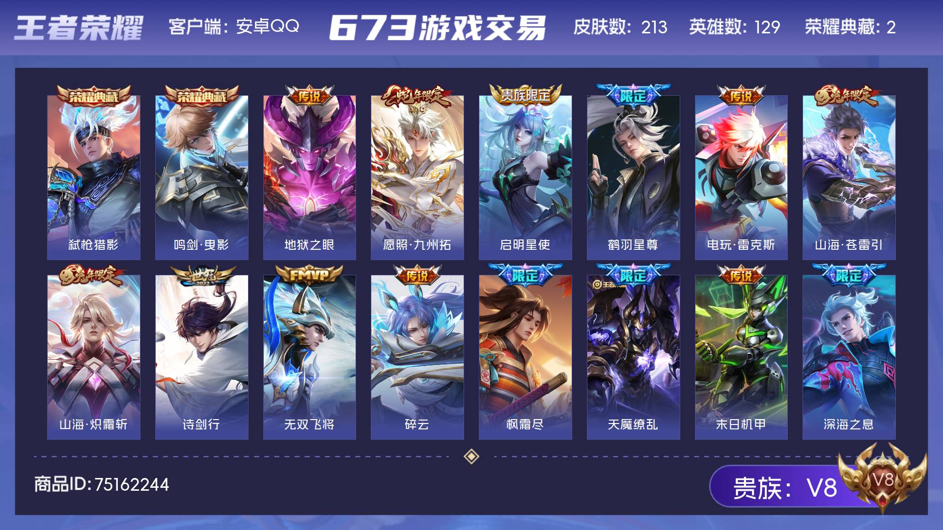 V8 皮肤213 英雄129 至尊星耀 荣耀典藏2 传说17 其他皮肤200