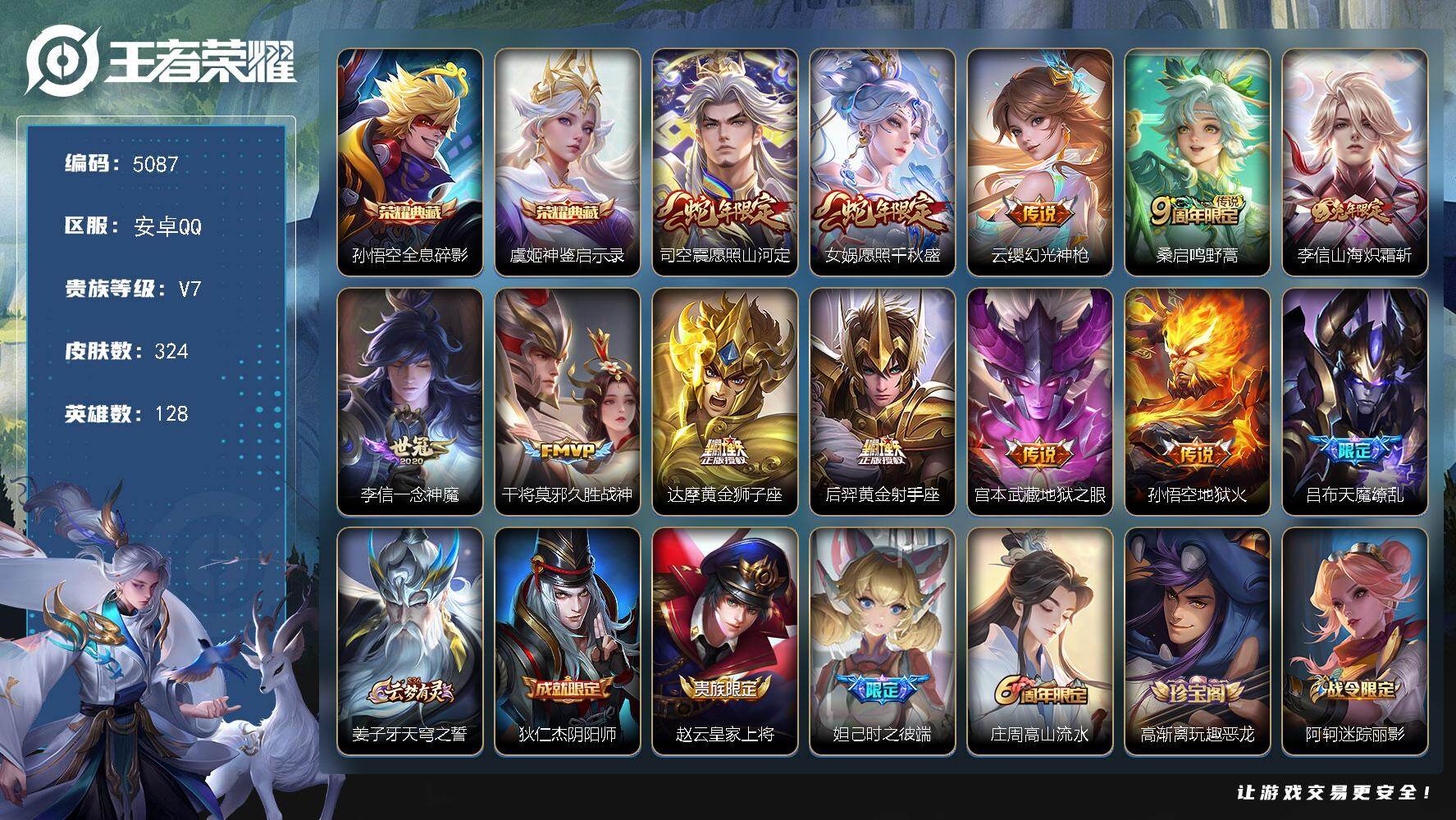 贵族7/皮肤324/典藏2/传说12/史诗86/英雄128/刘邦全皮/孙权全皮/