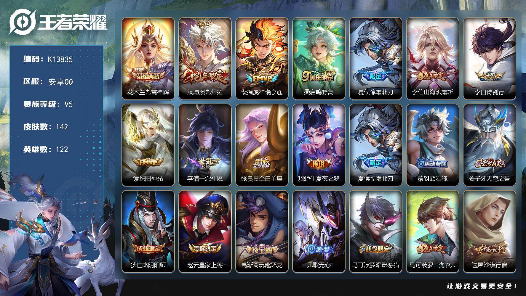 安卓Q-V5-最强王者段位-122英雄-142皮肤-1典藏皮肤-10传说-40史