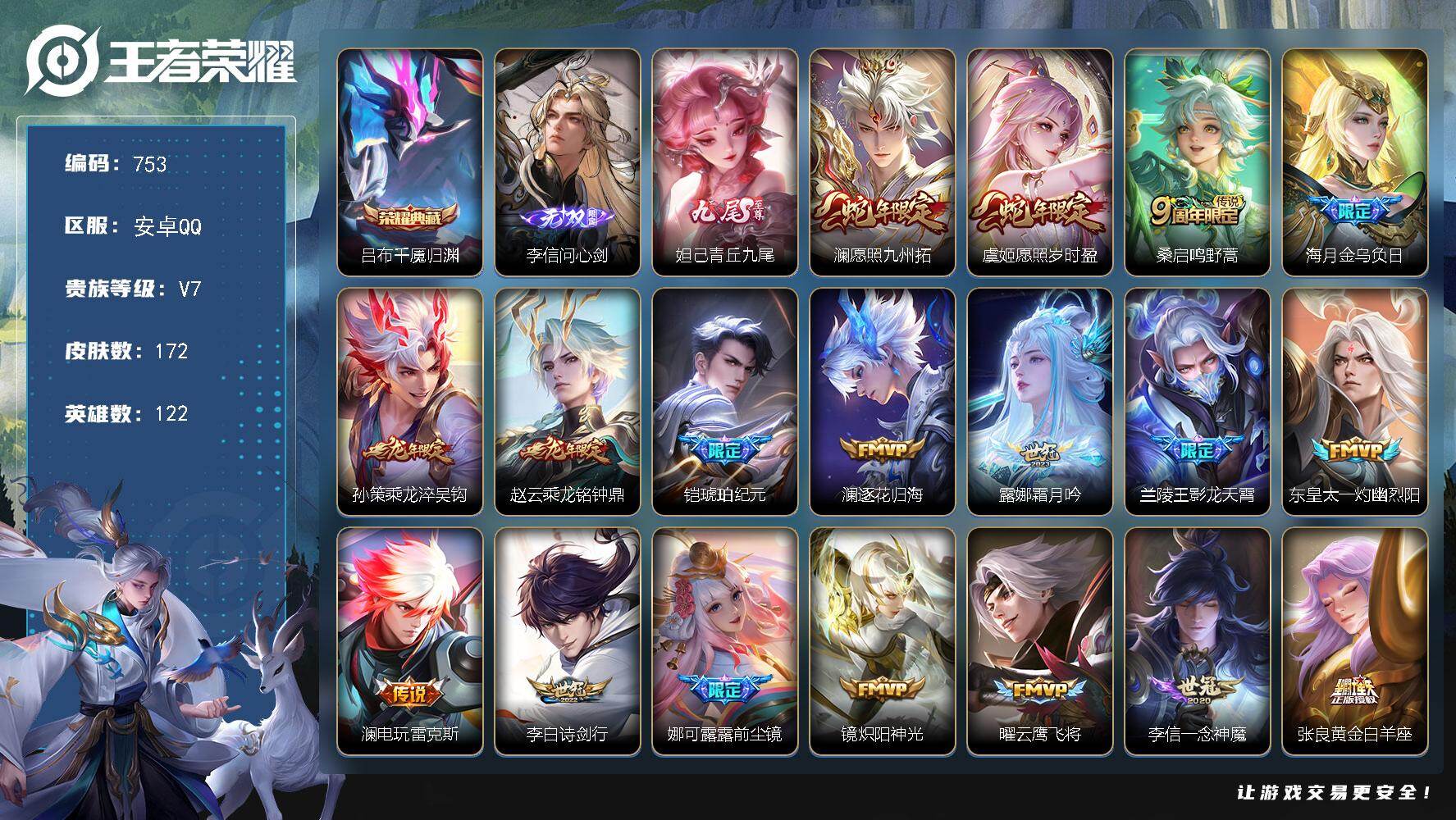 【特价出售】安卓Q-V6-可二次-126英雄-277皮肤-1典藏皮肤-12传说-