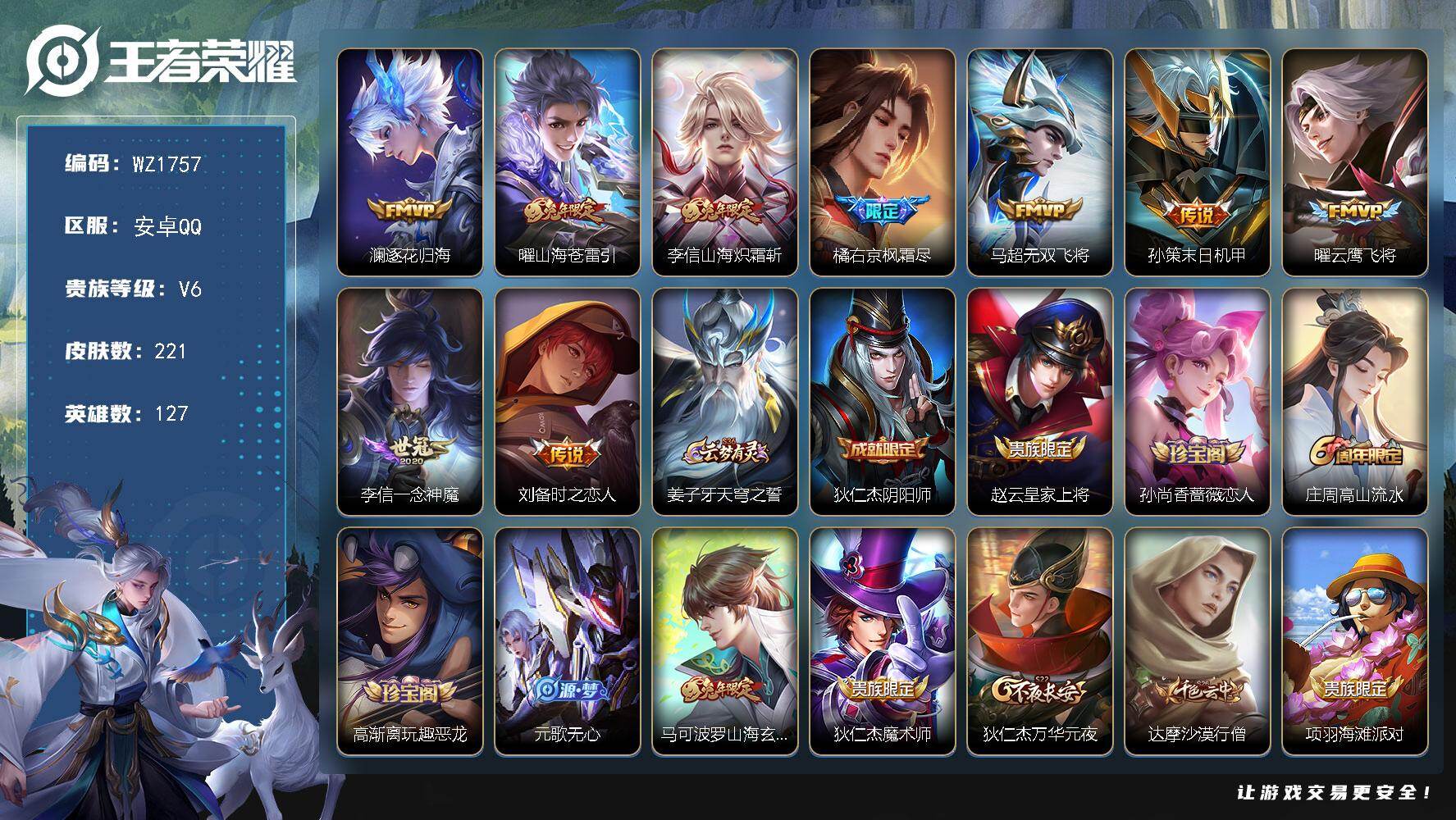【秒换绑】安卓Q-V6-尊贵铂金III段位-127英雄-221皮肤-9传说-5